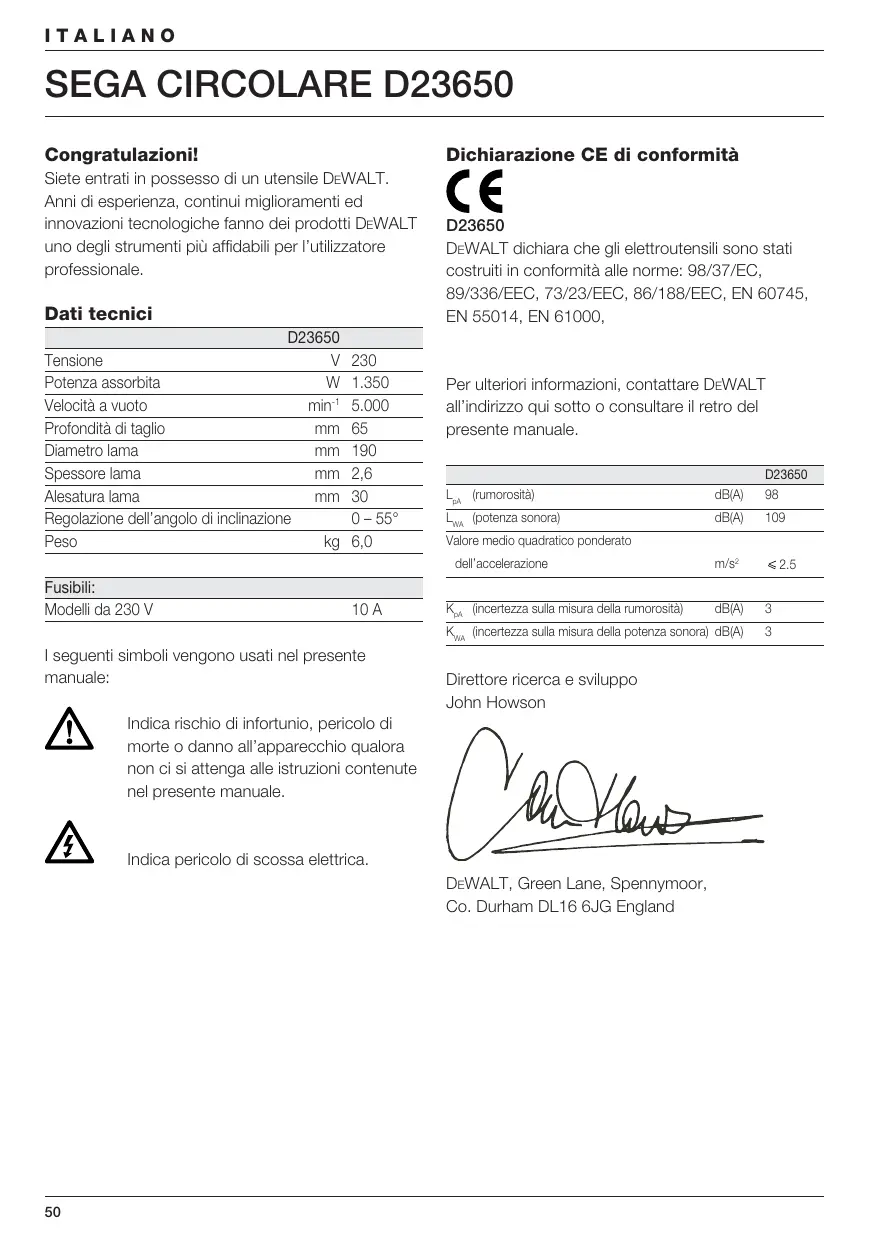 Congratulazioni! Dichiarazione CE di conformità Siete entrati in possesso di un utensile DEWALT. Anni di esperienza, continui miglioramenti ed innovazioni tecnologiche fanno dei prodotti DEWALT uno degli strumenti più affidabili per l’utilizzatore professionale. Dati tecnici D23650 Tensione Potenza assorbita Velocità a vuoto min-1 Profondità di taglio Diametro lama Spessore lama Alesatura lama Regolazione dell’angolo di inclinazione Peso