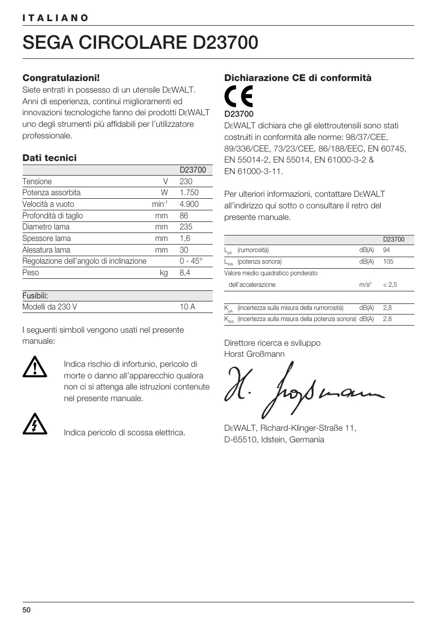 8,4 D23700 DEWALT dichiara che gli elettroutensili sono stati costruiti in conformità alle norme: 98/37/CEE, 89/336/CEE, 73/23/CEE, 86/188/EEC, EN 60745, EN 55014-2, EN 55014, EN 61000-3-2 & EN 61000-3-11. Per ulteriori informazioni, contattare DEWALT all’indirizzo qui sotto o consultare il retro del presente manuale. D23700 LpA (rumorosità) dB(A)