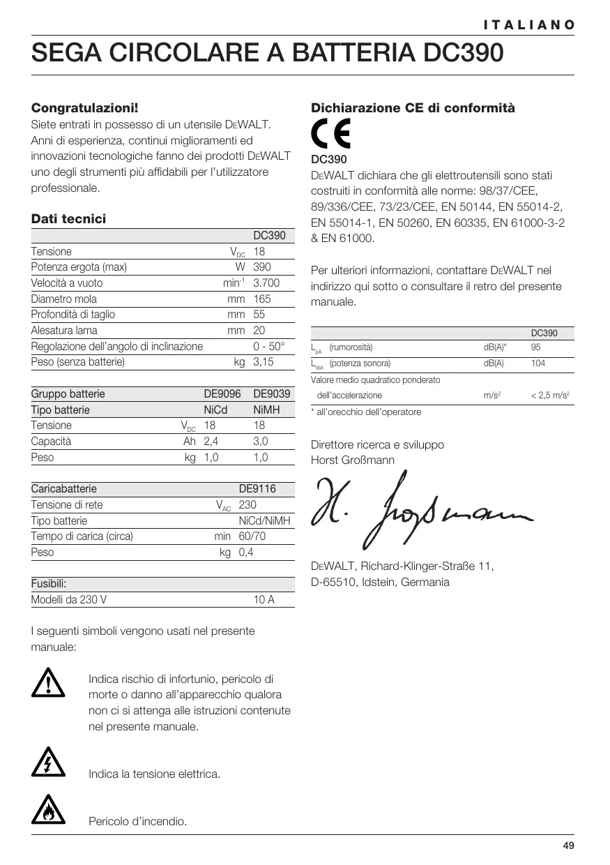 - all’orecchio dell’operatore Direttore ricerca e sviluppo Horst Großmann DE9116 VAC 230 NiCd/NiMH min 60/70 kg 0,4 Fusibili: Modelli da 230 V DEWALT, Richard-Klinger-Straße 11, D-65510, Idstein, Germania 10 A I seguenti simboli vengono usati nel presente manuale: Indica rischio di infortunio, pericolo di morte o danno all’apparecchio qualora non ci si attenga alle istruzioni contenute nel presente manuale. Indica la tensione elettrica. Pericolo d’incendio.