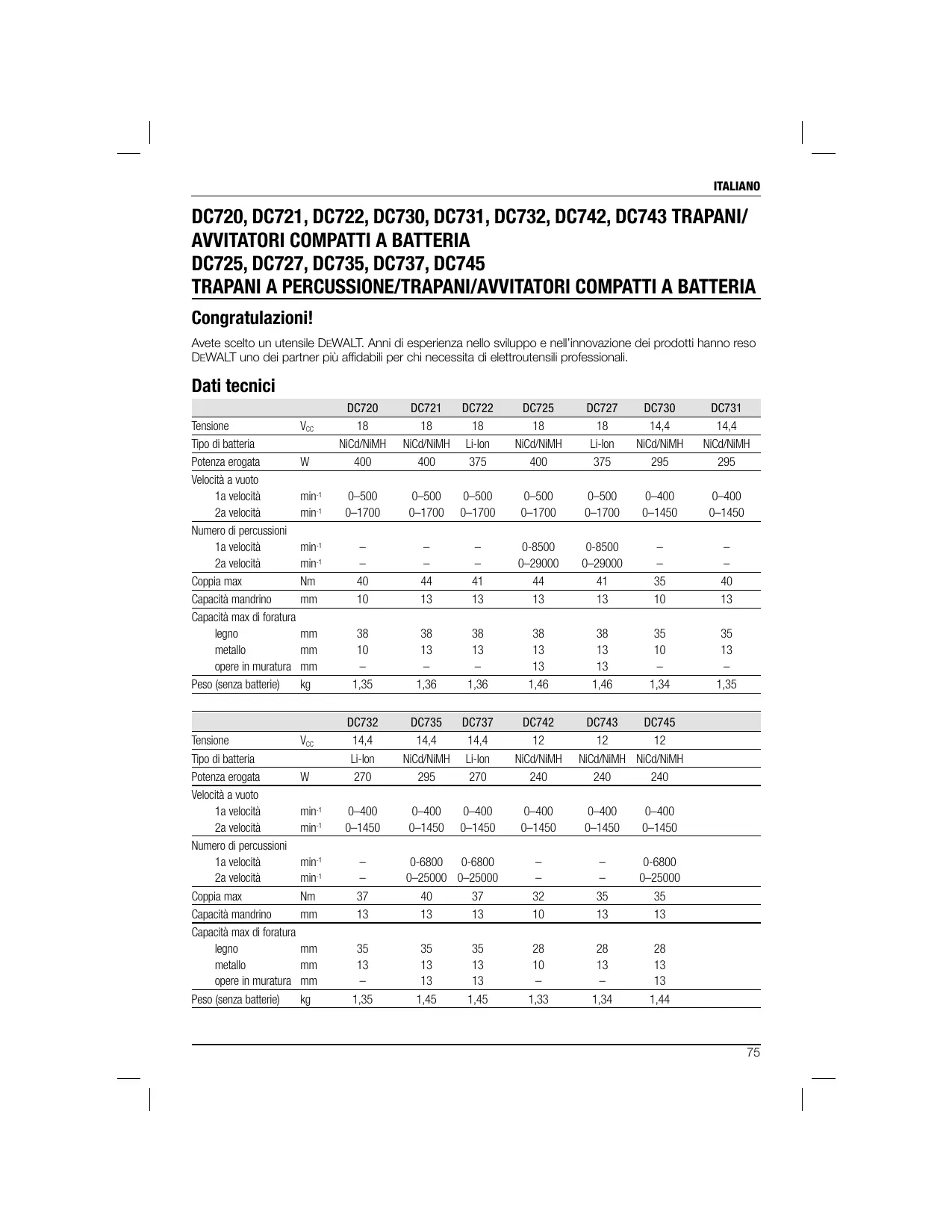 DC725, DC727, DC735, DC737, DC745 TRAPANI A PERCUSSIONE/TRAPANI/AVVITATORI COMPATTI A BATTERIA Congratulazioni! Avete scelto un utensile DEWALT. Anni di esperienza nello sviluppo e nell’innovazione dei prodotti hanno reso DEWALT uno dei partner più affidabili per chi necessita di elettroutensili professionali. Dati tecnici Tensione Tipo di batteria Potenza erogata Velocità a vuoto 1a velocità 2a velocità Numero di percussioni 1a velocità 2a velocità Coppia max Capacità mandrino Capacità max di foratura legno metallo opere in muratura Peso (senza batterie) Tensione Tipo di batteria Potenza erogata Velocità a vuoto 1a velocità 2a velocità Numero di percussioni 1a velocità 2a velocità Coppia max Capacità mandrino Capacità max di foratura legno metallo opere in muratura Peso (senza batterie) VCC