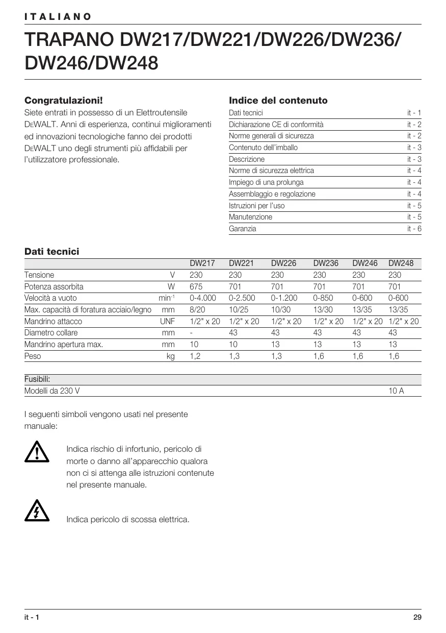 DW246/DW248 Congratulazioni! Indice del contenuto Siete entrati in possesso di un Elettroutensile DEWALT. Anni di esperienza, continui miglioramenti ed innovazioni tecnologiche fanno dei prodotti DEWALT uno degli strumenti più affidabili per l’utilizzatore professionale. Dati tecnici Dichiarazione CE di conformità Norme generali di sicurezza Contenuto dell’imballo Descrizione Norme di sicurezza elettrica Impiego di una prolunga Assemblaggio e regolazione Istruzioni per l’uso Manutenzione Garanzia it - 1 it - 2 it - 2 it - 3 it - 3 it - 4 it - 4 it - 4 it - 5 it - 5 it - 6 Dati tecnici Tensione Potenza assorbita Velocità a vuoto min-1 Max. capacità di foratura acciaio/legno mm Mandrino attacco UNF Diametro collare Mandrino apertura max. Peso