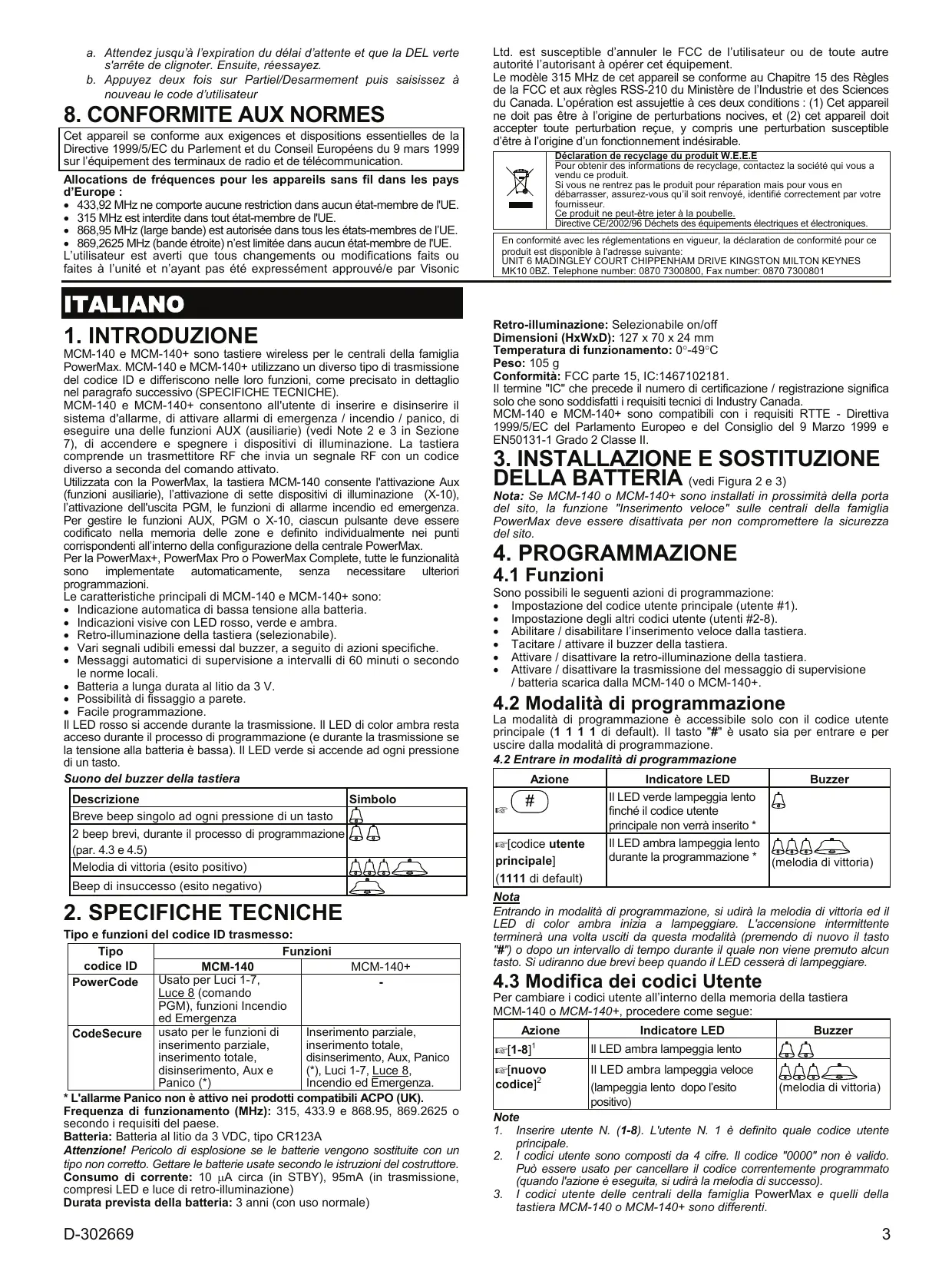 2. SPECIFICHE TECNICHE Tipo e funzioni del codice ID trasmesso: Tipo Funzioni codice ID MCM-140 MCM-140+ Usato per Luci 1-7, PowerCode Luce 8 (comando PGM), funzioni Incendio ed Emergenza Inserimento parziale, CodeSecure usato per le funzioni di inserimento parziale, inserimento totale, inserimento totale, disinserimento, Aux, Panico disinserimento, Aux e (*), Luci 1-7, Luce 8, Panico (*) Incendio ed Emergenza. * L'allarme Panico non è attivo nei prodotti compatibili ACPO (UK). Frequenza di funzionamento (MHz): 315, 433.9 e 868.95, 869.2625 o secondo i requisiti del paese. Batteria: Batteria al litio da 3 VDC, tipo CR123A Attenzione! Pericolo di esplosione se le batterie vengono sostituite con un tipo non corretto. Gettare le batterie usate secondo le istruzioni del costruttore. Consumo di corrente: 10 μA circa (in STBY), 95mA (in trasmissione, compresi LED e luce di retro-illuminazione) Durata prevista della batteria: 3 anni (con uso normale)