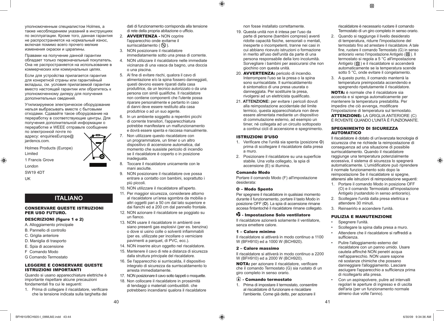 si guasti a causa di un problema tecnico o di fabbricazione, riportarla al punto d'acquisto insieme allo scontrino fiscale e ad una copia di questo certificato di garanzia. I diritti spettanti all'acquirente in base alle condizioni di questo certificato di garanzia sono in aggiunta a quelli previsti dalla legge che non risultano alterati dalle condizioni di questo certificato. Solo Holmes Products (Europe) Ltd. ("Holmes") ha l'autorità di modificare queste condizioni. Holmes si impegna a riparare o a sostituire gratuitamente nell'arco del periodo di garanzia qualsiasi parte dell'apparecchiatura dovesse risultare difettosa, a condizione che: • Si segnali tempestivamente il problema al punto d'acquisto o a Holmes; e • l'apparecchiatura non sia stata modificata in alcun modo né soggetta a danni, uso improprio o abuso, a riparazione o alterazione per opera di un tecnico non autorizzato da Holmes. I guasti intervenuti durante l'uso normale, per uso improprio, danno, abuso, tensione incorretta, cause naturali, eventi non determinati da Holmes, riparazione o alterazione per opera di un tecnico non autorizzato da Holmes o la mancata ottemperanza alle istruzioni d'uso sono esclusi dalla presente garanzia. Inoltre, l'uso normale compreso, a titolo di esempio, una lieve alterazione del colore (sbiadimento) e i graffi, non sono coperti dalla presente garanzia. I diritti spettante all'utente ai sensi della presente garanzia si applicano unicamente all'acquirente originale e non si estendono all'uso commerciale o comunitario. Se l’apparecchiatura è fornita con un accordo specifico per il paese o una cartolina di garanzia, consultare le condizioni di tale accordo, che prevalgono su quelle esposte in questa sede oppure rivolgersi a un rivenditore autorizzato per ulteriori informazioni. I prodotti elettrici vanno smaltiti separatamente dai rifiuti domestici. Consegnarli ad un centro di riciclaggio, se disponibile. Scrivere a enquiriesEurope@jardencs.com per istruzioni sul riciclaggio e informazioni sulla direttiva RAEE.