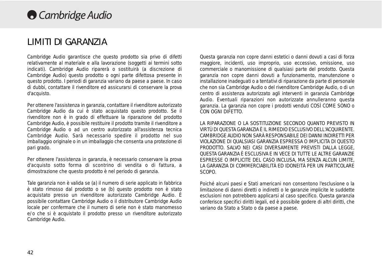 Questa garanzia non copre danni estetici o danni dovuti a casi di forza maggiore, incidenti, uso improprio, uso eccessivo, omissione, uso commerciale o manomissione di qualsiasi parte del prodotto. Questa garanzia non copre danni dovuti a funzionamento, manutenzione o installazione inadeguati o a tentativi di riparazione da parte di personale che non sia Cambridge Audio o del rivenditore Cambridge Audio, o di un centro di assistenza autorizzato agli interventi in garanzia Cambridge Audio. Eventuali riparazioni non autorizzate annulleranno questa garanzia. La garanzia non copre i prodotti venduti COSÌ COME SONO o CON OGNI DIFETTO. LA RIPARAZIONE O LA SOSTITUZIONE SECONDO QUANTO PREVISTO IN VIRTÙ DI QUESTA GARANZIA È IL RIMEDIO ESCLUSIVO DELL'ACQUIRENTE. CAMBRIDGE AUDIO NON SARÀ RESPONSABILE DEI DANNI INDIRETTI PER VIOLAZIONE DI QUALSIASI GARANZIA ESPRESSA O IMPLICITA DI QUESTO PRODOTTO. SALVO NEI CASI DIVERSAMENTE PREVISTI DALLA LEGGE, QUESTA GARANZIA È ESCLUSIVA E IN VECE DI TUTTE LE ALTRE GARANZIE ESPRESSE O IMPLICITE DEL CASO INCLUSA, MA SENZA ALCUN LIMITE, LA GARANZIA DI COMMERCIABILITÀ ED IDONEITÀ PER UN PARTICOLARE SCOPO. Poiché alcuni paesi e Stati americani non consentono l'esclusione o la limitazione di danni diretti o indiretti o le garanzie implicite le suddette esclusioni non potrebbero applicarsi al caso specifico. Questa garanzia conferisce specifici diritti legali, ed è possibile godere di altri diritti, che variano da Stato a Stato o da paese a paese.