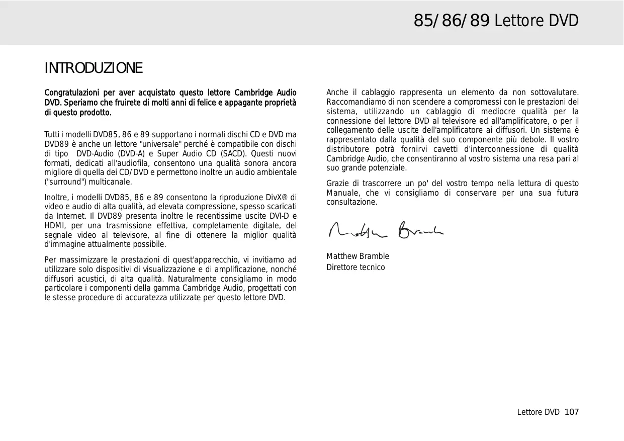 85/86/89 Lettore DVD INTRODUZIONE Congratulazioni per aver acquistato questo lettore Cambridge Audio DVD. Speriamo che fruirete di molti anni di felice e appagante proprietà di questo prodotto. Tutti i modelli DVD85, 86 e 89 supportano i normali dischi CD e DVD ma DVD89 è anche un lettore "universale" perché è compatibile con dischi di tipo DVD-Audio (DVD-A) e Super Audio CD (SACD). Questi nuovi formati, dedicati all'audiofila, consentono una qualità sonora ancora migliore di quella dei CD/DVD e permettono inoltre un audio ambientale ("surround") multicanale. Inoltre, i modelli DVD85, 86 e 89 consentono la riproduzione DivX® di video e audio di alta qualità, ad elevata compressione, spesso scaricati da Internet. Il DVD89 presenta inoltre le recentissime uscite DVI-D e HDMI, per una trasmissione effettiva, completamente digitale, del segnale video al televisore, al fine di ottenere la miglior qualità d'immagine attualmente possibile. Per massimizzare le prestazioni di quest'apparecchio, vi invitiamo ad utilizzare solo dispositivi di visualizzazione e di amplificazione, nonché diffusori acustici, di alta qualità. Naturalmente consigliamo in modo particolare i componenti della gamma Cambridge Audio, progettati con le stesse procedure di accuratezza utilizzate per questo lettore DVD.