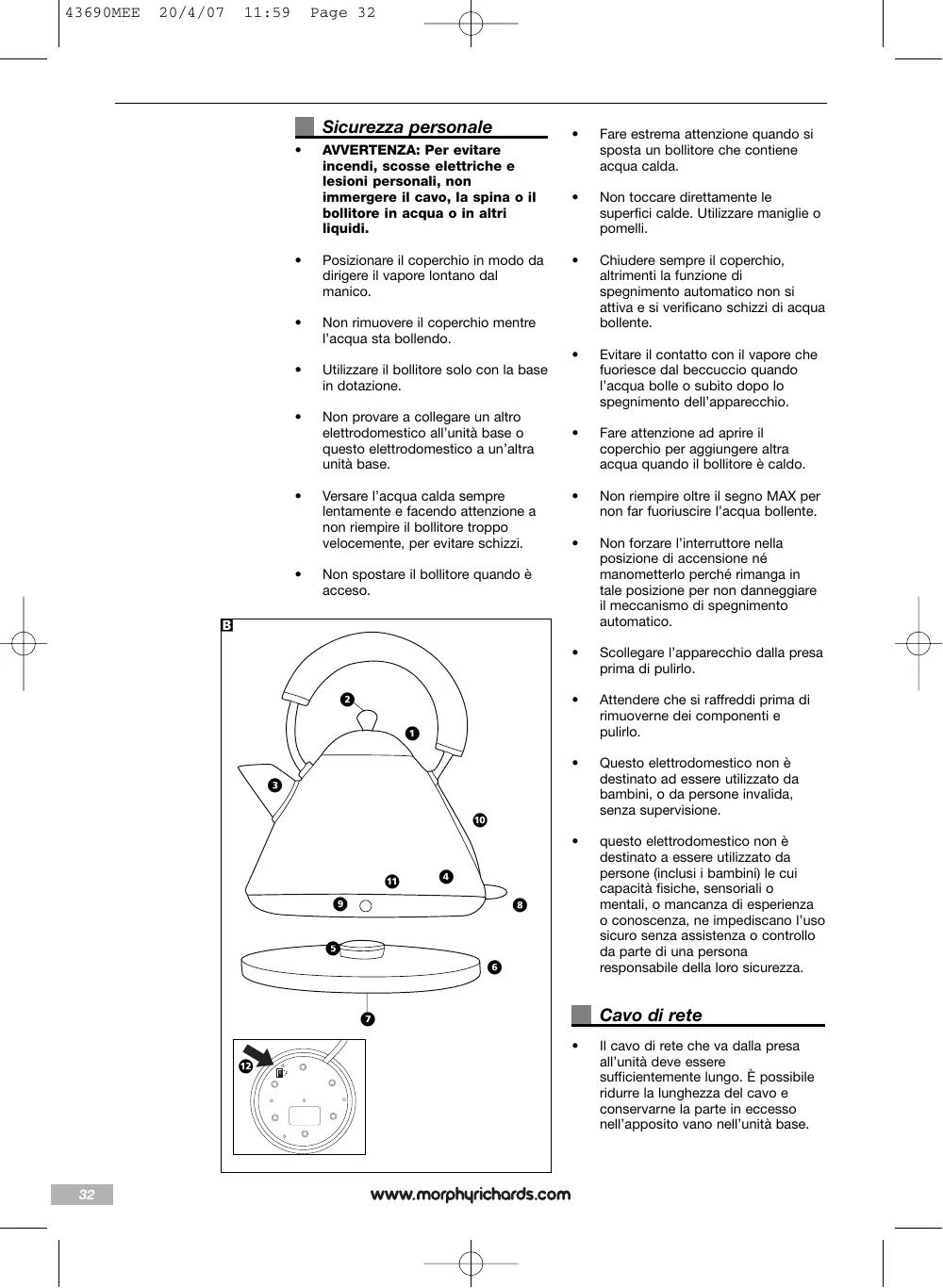 Pulire bene l’esterno del bollitore con un panno umido per rimuovere tracce di acido che possono danneggiare la finitura. 43690MEE 20/4/07 11:59 Page 35 IMPORTANTE: verificare che i collegamenti elettrici siano completamente asciutti prima di utilizzare il bollitore. riportati sul prodotto oppure scrivere a Morphy Richards all’indirizzo indicato. Verrà richiesto di rispedire il prodotto (in un imballaggio idoneo e sicuro) unitamente alla copia della prova d’acquisto. Pulizia AVVERTENZA: scollegare sempre la spina dalla presa e lasciare che il bollitore si raffreddi prima di pulirlo. Fatte salve le esclusioni sotto riportate (1-6), l’elettrodomestico difettoso viene riparato o sostituito e spedito di solito entro 7 giorni lavorativi dal ricevimento. Pulire la superficie esterna con un panno umido. Se per qualsiasi motivo questo articolo viene sostituito entro il periodo di garanzia di 2 anni, la garanzia sul nuovo prodotto sarà calcolata a decorrere dalla data dell’acquisto iniziale. È pertanto importante conservare la ricevuta o fattura originale per poter dimostrare la data dell’acquisto. IMPORTANTE: non utilizzare detergenti abrasivi sulla superficie esterna del bollitore per non graffiarla. Funzione “fischio”