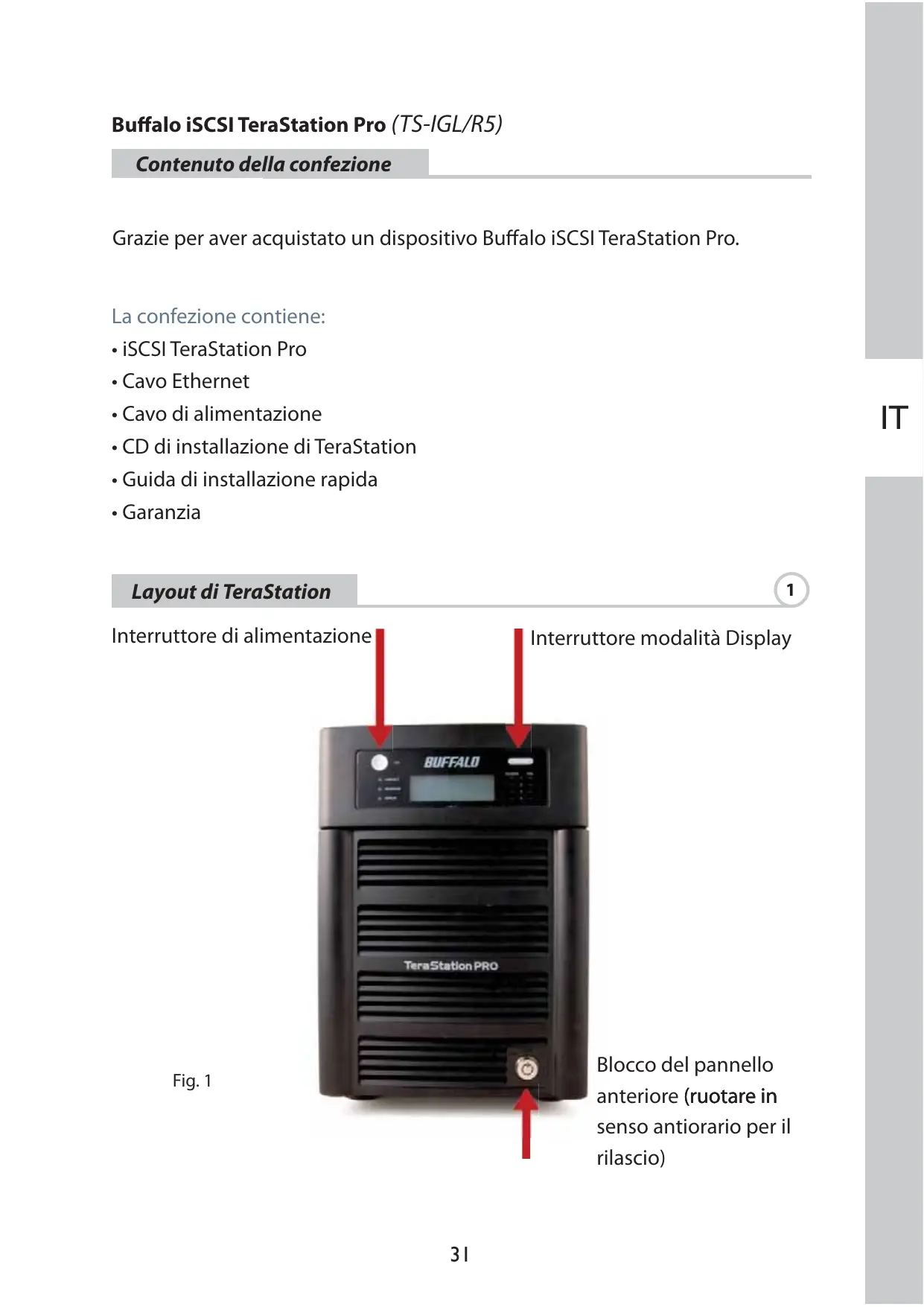 Buffalo iSCSI TeraStation Pro (TS-IGL/R5) Contenuto della confezione Grazie per aver acquistato un dispositivo Buffalo iSCSI TeraStation Pro.