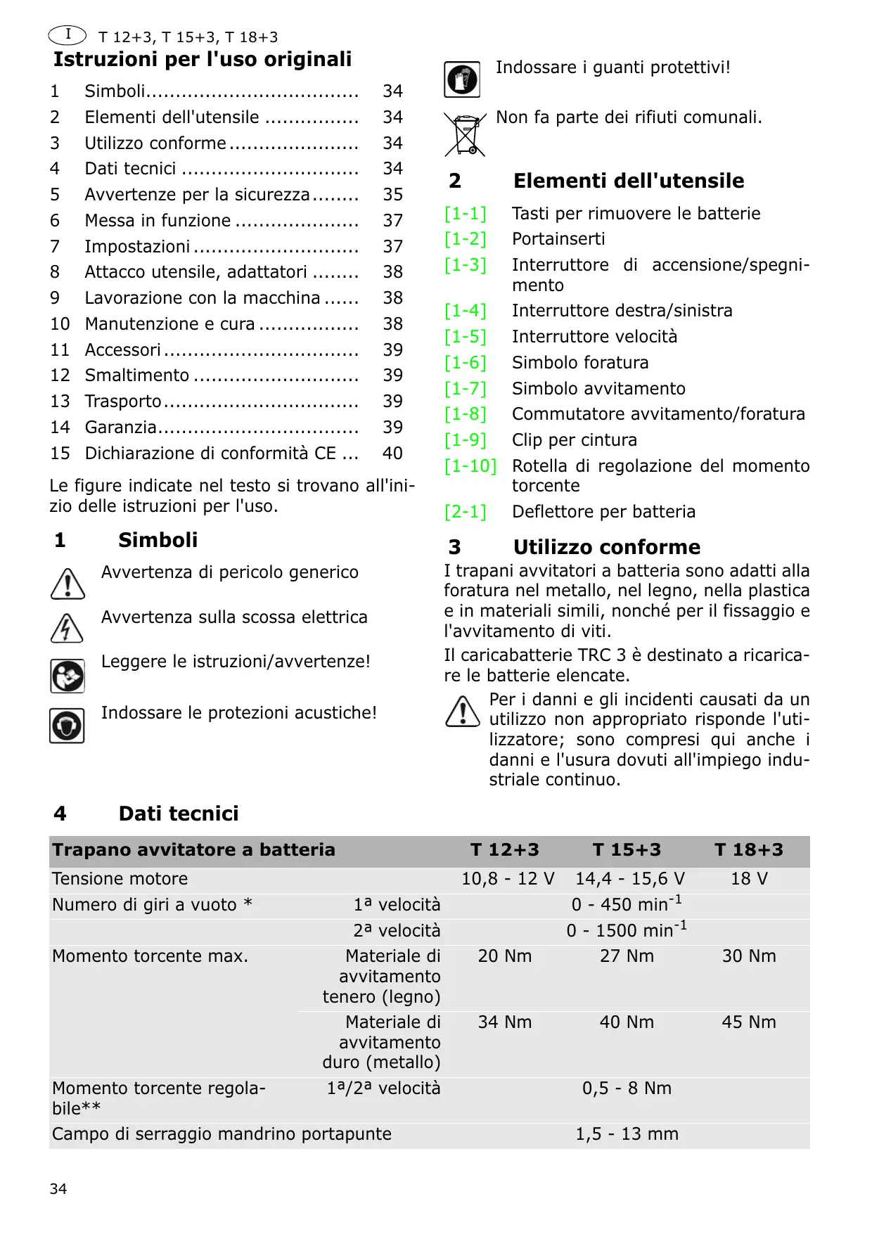 ca. 22/ 45 min ca. 35/ 70 min ca. 25/ 50 min ca. 50/ 70 min da -5 °C a +45 °C con resistenza NTC T 12+3 T 15+3 T 18+3 BPC 12 Li al litio 10,8 V 2,6 Ah 0,5 kg BPS 12 C BPC 15 Li al litio 14,4 V 2,6 Ah 0,6 kg BPS 15,6 S BPC 18 Li al litio 18 V 2,6 Ah 0,7 kg NiMH 12 V 2,0 Ah 0,6 kg NiMH 15,6 V 3,0 Ah 0,9 kg Avvertenze per la sicurezza Avvertenze di sicurezza generali Avvertenza! Leggere tutte le avvertenze per la sicurezza e le indicazioni.Eventuali errori nell'osservanza delle avvertenze e delle indicazioni possono provocare scosse elettriche, incendi e/o gravi lesioni. Conservate tutte le avvertenze di sicurezza e i manuali per riferimenti futuri. Il termine "utensile elettrico" usato nelle avvertenze di sicurezza, si riferisce agli utensili elettrici collegati alla rete elettrica (con cavo di rete) e agli utensili elettrici azionati a batteria (senza cavo di rete). Avvertenze di sicurezza specifiche della macchina – Tenere l'utensile soltanto per le maniglie isolate quando si eseguono lavori durante i quali la vite può incontrare cavi elettrici nascosti.Il contatto della vite con un cavo sotto tensione può mette35