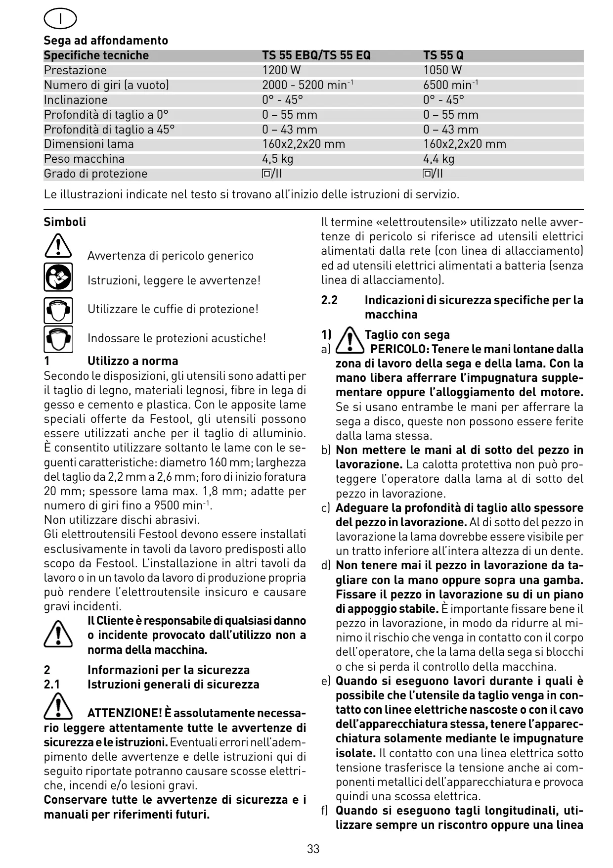 1200 W 2000 - 5200 min-1 0° - 45° 0 – 55 mm 0 – 43 mm 160x2,2x20 mm 4,5 kg /II TS 55 Q 1050 W 6500 min-1 0° - 45° 0 – 55 mm 0 – 43 mm 160x2,2x20 mm 4,4 kg /II Le illustrazioni indicate nel testo si trovano all’inizio delle istruzioni di servizio. Simboli Il termine «elettroutensile» utilizzato nelle avvertenze di pericolo si riferisce ad utensili elettrici alimentati dalla rete (con linea di allacciamento) ed ad utensili elettrici alimentati a batteria (senza linea di allacciamento). Avvertenza di pericolo generico Istruzioni, leggere le avvertenze!