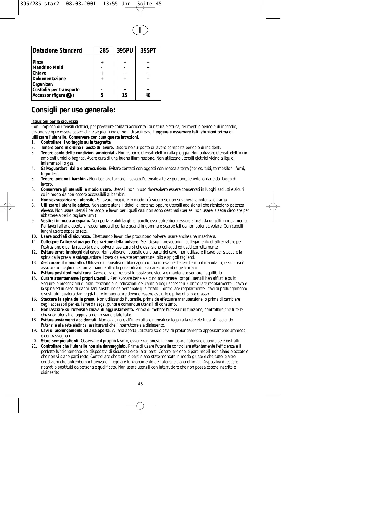 Consigli per uso generale: Istruzioni per la sicurezza Con l'impiego di utensili elettrici, per prevenire contatti accidentali di natura elettrica, ferimenti e pericolo di incendio, devono sempre essere osservate le seguenti indicazioni di sicurezza. Leggere e osservare tali istruzioni prima di utilizzare l'utensile. Conservare con cura queste istruzioni. 1. Controllare il voltaggio sulla targhetta 2. Tenere bene in ordine il posto di lavoro. Disordine sul posto di lavoro comporta pericolo di incidenti. 3. Tenere conto delle condizioni ambientali. Non esporre utensili elettrici alla pioggia. Non utilizzare utensili elettrici in ambienti umidi o bagnati. Avere cura di una buona illuminazione. Non utilizzare utensili elettrici vicino a liquidi infiammabili o gas. 4. Salvaguardarsi dalla elettrocuzione. Evitare contatti con oggetti con messa a terra (per es. tubi, termosifoni, forni, frigoriferi). 5. Tenere lontano i bambini. Non lasciare toccare il cavo o l'utensile a terze persone; tenerle lontane dal luogo di lavoro. 6. Conservare gli utensili in modo sicuro. Utensili non in uso dovrebbero essere conservati in luoghi asciutti e sicuri ed in modo da non essere accessibili ai bambini. 7. Non sovraccaricare l'utensile. Si lavora meglio e in modo più sicuro se non si supera la potenza di targa. 8. Utilizzare l'utensile adatto. Non usare utensili deboli di potenza oppure utensili addizionali che richiedono potenza elevata. Non usare utensili per scopi e lavori per i quali casi non sono destinati (per es. non usare la sega circolare per abbattere alberi o tagliare rami). 9. Vestirsi in modo adeguato. Non portare abiti larghi e gioielli; essi potrebbero essere attirati da oggetti in movimento. Per lavori all'aria aperta si raccomanda di portare guanti in gomma e scarpe tali da non poter scivolare. Con capelli lunghi usare apposita rete. 10. Usare occhiali di sicurezza. Effettuando lavori che producono polvere, usare anche una maschera. 11. Collegare l'attrezzatura per l'estrazione della polvere. Se i designi prevedono il collegamento di attrezzature per l'estrazione e per la raccolta della polvere, assicurarsi che essi siano collegati ed usati correttamente. 12. Evitare errati impieghi del cavo. Non sollevare l'utensile dalla parte del cavo, non utilizzare il cavo per staccare la spina dalla presa, e salvaguardare il cavo da elevate temperature, olio e spigoli taglienti. 13. Assicurare il manufatto. Utilizzare dispositivi di bloccaggio o una morsa per tenere fermo il manufatto; esso cosi è assicurato meglio che con la mano e offre la possibilità di lavorare con ambedue le mani. 14. Evitare posizioni malsicure. Avere cura di trovarsi in posizione sicura e mantenere sempre l'equilibrio. 15. Curare attentamente i propri utensili. Per lavorare bene e sicuro mantenere i propri utensili ben affilati e puliti. Seguire le prescrizioni di manutenzione e le indicazioni del cambio degli accessori. Controllare regolarmente il cavo e la spina ed in caso di danni, farli sostituire da personale qualificato. Controllare regolarmente i cavi di prolungamento e sostituirli qualora danneggiati. Le impugnature devono essere asciutte e prive di olio e grasso. 16. Staccare la spina della presa. Non utilizzando l'utensile, prima de effettuare manutenzione, o prima di cambiare degli accessori per es. lame da sega, punte e comunque utensili di consumo. 17. Non lasciare sull'utensile chiavi di aggiustamento. Prima di mettere l'utensile in funzione, controllare che tute le chiavi ed utensili di aggiustamento siano state tolte. 18. Evitare avviamenti accidentali. Non avvicinare all'interruttore utensili collegati alla rete elettrica. Allacciando l'utensile alla rete elettrica, assicurarsi che l'interruttore sia disinserito. 19. Cavi di prolungamento all'aria aperta. All'aria aperta utilizzare solo cavi di prolungamento appositamente ammessi e contrassegnati. 20. Stare sempre attenti. Osservare il proprio lavoro, essere ragionevoli, e non usare l'utensile quando se è distratti. 21. Controllare che l'utensile non sia danneggiato. Prima di usare l'utensile controllare attentamente l'efficienza e il perfetto funzionamento dei dispositivi di sicurezza e dell'altri parti. Controllare che le parti mobili non siano bloccate e che non vi siano parti rotte. Controllare che tutte le parti siano state montate in modo giuste e che tutte le altre condizioni che potrebbero influenzare il regolare funzionamento dell'utensile siano ottimali. Dispositivi di essere riparati o sostituiti da personale qualificato. Non usare utensili con interruttore che non possa essere inserito e disinserito. 45
