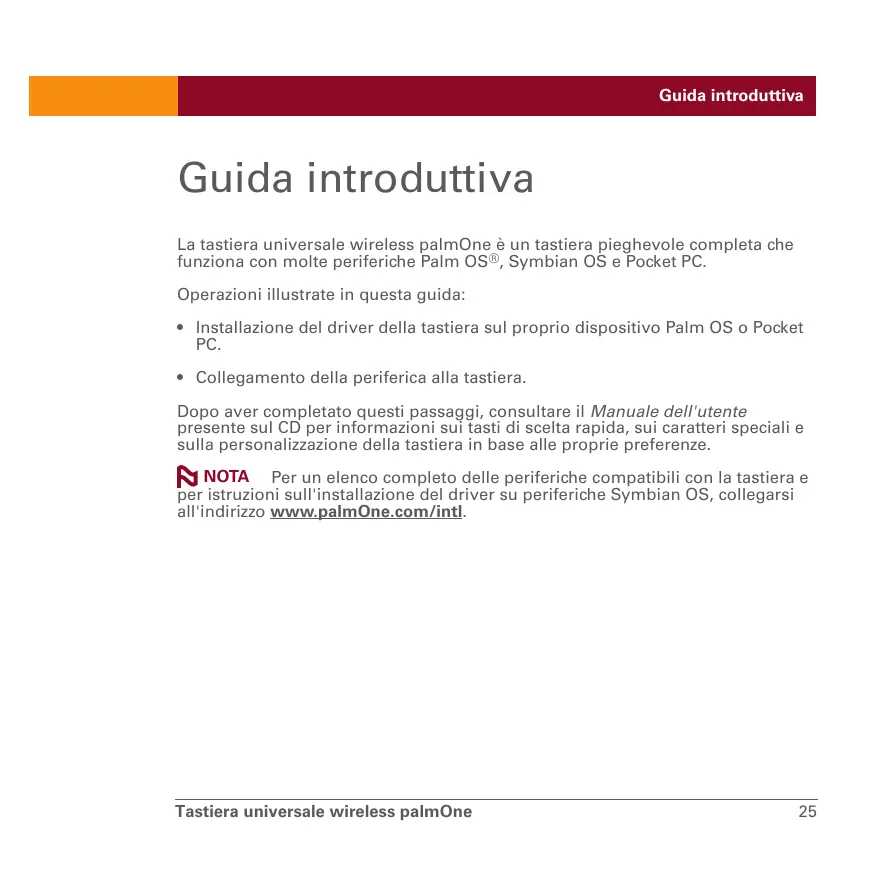 - Collegamento della periferica alla tastiera. Dopo aver completato questi passaggi, consultare il Manuale dell'utente presente sul CD per informazioni sui tasti di scelta rapida, sui caratteri speciali e sulla personalizzazione della tastiera in base alle proprie preferenze. NOTA Per un elenco completo delle periferiche compatibili con la tastiera e per istruzioni sull'installazione del driver su periferiche Symbian OS, collegarsi all'indirizzo www.palmOne.com/intl. Tastiera universale wireless palmOne