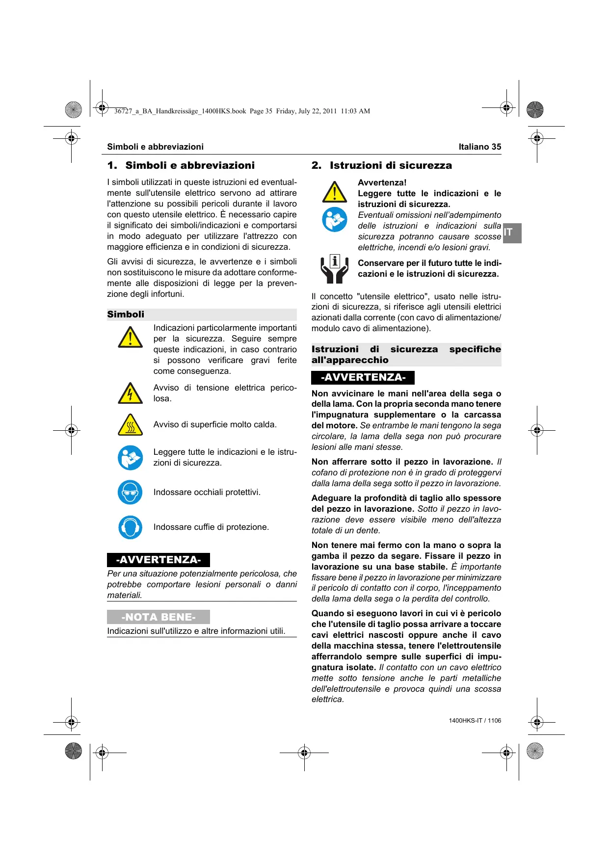 Il concetto "utensile elettrico", usato nelle istru- zioni di sicurezza, si riferisce agli utensili elettrici azionati dalla corrente (con cavo di alimentazione/ modulo cavo di alimentazione). Awvertenzal Leggere tutte le indicazioni e le istruzioni di sicurezza. Eventuali omissioni nell'adempimento delle istruzioni € indicazioni elettriche, incendi e/o lesioni gravi. Conservare per il futuro tutte le indi- cazioni e le istruzioni di sicurezza. sicurezza specifiche all'apparecchio -AVVERTENZA: Non awvicinare le mani nell'area della sega o della lama. Con la propria seconda mano tenere l'impugnatura supplementare o la carcassa del motore. Se entrambe le mani tengono la sega circolare, la lama della sega non pu procurare lesioni alle mani stesse. Non afferrare sotto il pezzo in lavorazione. I! cofano di protezione non 8 in grado di proteggervi dalla lama della sega sotto il pezzo in lavorazione. Adeguare la profondità di taglio allo spessore del pezzo in lavorazione. Softo il pezzo in lavo- razione deve essere visibile meno dell'altezza totale di un dente. Non tenere mai fermo con la mano o sopra la gamba il pezzo da segare. Fissare il pezzo in lavorazione su una base stabile. À importante fissare bene il pezzo in lavorazione per minimizzare il pericolo di contatto con il corpo, l'inceppamento della lama della sega o la perdita del controllo. Quando si eseguono lavori in cui vi à pericolo che l'utensile di taglio possa arrivare a toccare cavi elettrici nascosti oppure anche il cavo della macchina stessa, tenere l'elettroutensile afferrandolo sempre sulle superfici di impu- gnatura isolate. I! contatto con un cavo elettrico mette sotto tensione anche le parti metalliche dellelettroutensile e provoca quindi una scossa elettrica. 1400HKS-IT / 1108