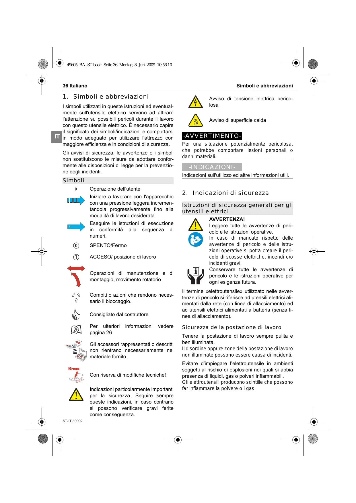 Operazione dell'utente Iniziare a lavorare con l'apparecchio con una pressione leggera incrementandola progressivamente fino alla modalità di lavoro desiderata. Eseguire le istruzioni di esecuzione in conformità alla sequenza di numeri. SPENTO/Fermo ACCESO/ posizione di lavoro Operazioni di manutenzione e di montaggio, movimento rotatorio Compiti o azioni che rendono necessario il bloccaggio. Consigliato dal costruttore Per ulteriori pagina 26 informazioni vedere Gli accessori rappresentati o descritti non rientrano necessariamente nel materiale fornito. Con riserva di modifiche tecniche! Indicazioni particolarmente importanti per la sicurezza. Seguire sempre queste indicazioni, in caso contrario si possono verificare gravi ferite come conseguenza. ST-IT / 0902 Avviso di tensione elettrica pericolosa Avviso di superficie calda -AVVERTIMENTOPer una situazione potenzialmente pericolosa, che potrebbe comportare lesioni personali o danni materiali. -INDICAZIONIIndicazioni sull'utilizzo ed altre informazioni utili.