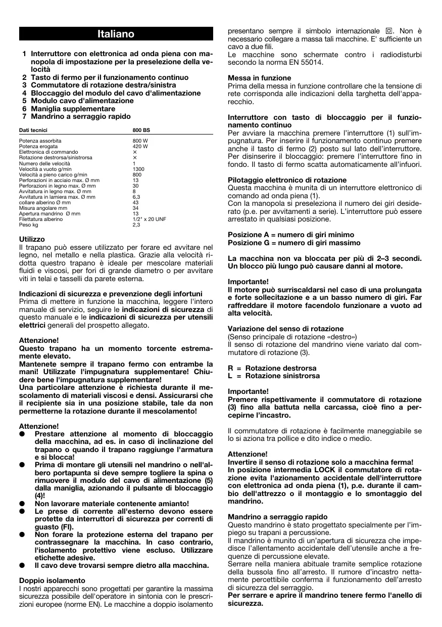 1/2" x 20 UNF 2,3 Utilizzo Il trapano può essere utilizzato per forare ed avvitare nel legno, nel metallo e nella plastica. Grazie alla velocità ridotta questro trapano è ideale per mescolare materiali fluidi e viscosi, per fori di grande diametro o per avvitare viti in telai e tasselli da parete esterna. Indicazioni di sicurezza e prevenzione degli infortuni Prima di mettere in funzione la macchina, leggere l'intero manuale di servizio, seguire le indicazioni di sicurezza di questo manuale e le indicazioni di sicurezza per utensili elettrici generali del prospetto allegato. Attenzione! Questo trapano ha un momento torcente estremamente elevato. Mantenete sempre il trapano fermo con entrambe la mani! Utilizzate l'impugnatura supplementare! Chiudere bene l'impugnatura supplementare! Una particolare attenzione è richiesta durante il mescolamento di materiali viscosi e densi. Assicurarsi che il recipiente sia in una posizione stabile, tale da non permetterne la rotazione durante il mescolamento! Attenzione! ● Prestare attenzione al momento di bloccaggio della macchina, ad es. in caso di inclinazione del trapano o quando il trapano raggiunge l'armatura e si blocca! ● Prima di montare gli utensili nel mandrino o nell'albero portapunta si deve sempre togliere la spina o rimuovere il modulo del cavo di alimentazione (5) dalla maniglia, azionando il pulsante di bloccaggio (4)! ● Non lavorare materiale contenente amianto! ● Le prese di corrente all'esterno devono essere protette da interruttori di sicurezza per correnti di guasto (FI). ● Non forare la protezione esterna del trapano per contrassegnare la macchina. In caso contrario, l'isolamento protettivo viene escluso. Utilizzare etichette adesive. ● Il cavo deve trovarsi sempre dietro alla macchina. Doppio isolamento I nostri apparecchi sono progettati per garantire la massima sicurezza possibile dell'operatore in sintonia con le prescrizioni europee (norme EN). Le macchine a doppio isolamento presentano sempre il simbolo internazionale . Non è necessario collegare a massa tali macchine. E' sufficiente un cavo a due fili. Le macchine sono schermate contro i radiodisturbi secondo la norma EN 55014. Messa in funzione Prima della messa in funzione controllare che la tensione di rete corrisponda alle indicazioni della targhetta dell'apparecchio. Interruttore con tasto di bloccaggio per il funzionamento continuo Per avviare la macchina premere l’interruttore (1) sull’impugnatura. Per inserire il funzionamento continuo premere anche il tasto di fermo (2) posto sul lato dell’interruttore. Per disinserire il bloccaggio: premere l’interruttore fino in fondo. Il tasto di fermo scatta automaticamente all’infuori. Pilotaggio elettronico di rotazione Questa macchina è munita di un interruttore elettronico di comando ad onda piena (1). Con la manopola si preseleziona il numero dei giri desiderato (p.e. per avvitamenti a serie). L’interruttore può essere arrestato in qualsiasi posizione. Posizione A = numero di giri minimo Posizione G = numero di giri massimo La macchina non va bloccata per più di 2–3 secondi. Un blocco più lungo può causare danni al motore. Importante! Il motore può surriscaldarsi nel caso di una prolungata e forte sollecitazione e a un basso numero di giri. Far raffreddare il motore facendolo funzionare a vuoto ad alta velocità. Variazione del senso di rotazione (Senso principale di rotazione «destro») Il senso di rotazione del mandrino viene variato dal commutatore di rotazione (3). R = Rotazione destrorsa L = Rotazione sinistrorsa Importante! Premere rispettivamente il commutatore di rotazione (3) fino alla battuta nella carcassa, cioè fino a percepirne l’incastro. Il commutatore di rotazione è facilmente maneggiabile se lo si aziona tra pollice e dito indice o medio. Attenzione! Invertire il senso di rotazione solo a macchina ferma! In posizione intermedia LOCK il commutatore di rotazione evita l'azionamento accidentale dell'interruttore con elettronica ad onda piena (1), p.e. durante il cambio dell'attrezzo o il montaggio e lo smontaggio del mandrino. Mandrino a serraggio rapido Questo mandrino è stato progettato specialmente per l’impiego su trapani a percussione. Il mandrino è munito di un’apertura di sicurezza che impedisce l’allentamento accidentale dell’utensile anche a frequenze di percussione elevate. Serrare nella maniera abituale tramite semplice rotazione della bussola fino all’arresto. Il rumore d’incastro nettamente percettibile conferma il funzionamento dell’arresto di sicurezza del serraggio. Per serrare e aprire il mandrino tenere fermo l'anello di sicurezza. Avvitare Accertarsi che viti e punte (Bits) siano di uguale forma e dimensione. Utilizzare preferibilmente viti con intaglio a croce. L’autocentraggio rende sicuro il lavoro. Si consigliano viti TORX e punte corrispondenti. Un fissassio sicuro delle punte nella testa della vite assicura un avvitamento ottimale Filettature Il trapano per l’elettronica incorporata e per la commutazione del senso di rotazione è adatto anche per filettare. Si consiglia l’impiego di maschi da macchina. Il maschio viene serrato nella pinza del mandrino. L’elettronica di comando è da usare con sensibilità e con la dovuta attenzione, per evitare la rottura del maschio, sopratutto filettando fori ciechi. Importante! Filettare solo a bassa velocità. Avviso importante per macchine a rotazione destrorsa/ sinistrorsa. Rimontaggio del mandrino: Attenzione! Prima dello smontaggio e del rimontaggio del mandrino, staccare la spina dell'alimentazione oppure estrarre il modulo del cavo d'alimentazione (5) dall'impugnatura agendo sul tasto di bloccaggio (4)! Attenzione! Prima di smontare e montare nuovamente il mandrino di serraggio, portare il commutatore di rotazione (3) sulla posizione LOCK. In questo modo viene impedito un azionamento accidentale dell’interruttore ad onda piena (1). Prima di sostituire un mandrino portapunta d