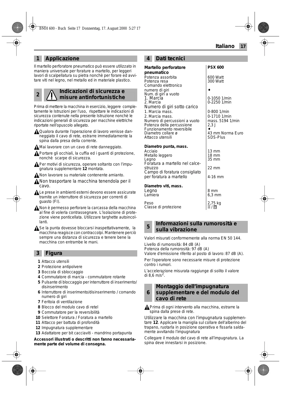 Prima di mettere la macchina in esercizio, leggere completamente le Istruzioni per l’uso, rispettare le indicazioni di sicurezza contenute nella presente Istruzione nonchè le indicazioni generali di sicurezza per macchine elettriche riportate nell’opuscolo allegato. Qualora durante l’operazione di lavoro venisse danneggiato il cavo di rete, estrarre immediatamente la spina dalla presa della corrente. Mai lavorare con un cavo di rete danneggiato. Portare gli occhiali, la cuffia ed i guanti di protezione, nonchè scarpe di sicurezza. Per motivi di sicurezza, operare soltanto con l’impugnatura supplementare 12 montata. Non lavorare su materiale contenente amianto. Non trasportare la macchina tenendola per il cavo. Le prese in ambienti esterni devono essere assicurate tramite un interruttore di sicurezza per correnti di guasto (FI). Non è permesso perforare la carcassa della macchina al fine di volerla contrassegnare. L’isolazione di protezione viene ponticellata. Utilizzare targhette autoincollanti. Se la punta dovesse bloccarsi inaspettativamente, la macchina reagisce con contraccolpi. Mantenere perciò sempre una distanza di sicurezza e tenere bene la macchina con entrambe le mani.