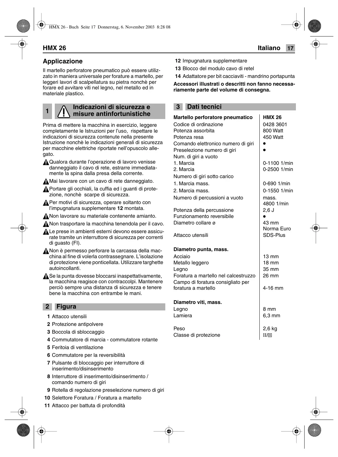 HMX 26 HMX 26 - Buch Seite 17 Donnerstag, 6. November 2003 8:28 08 Italiano 17 Applicazione Il martello perforatore pneumatico pu essere utiliz- Zato in maniera universale per forature a martello, per leggeri lavori di scalpellatura su pietra nonchè per forare ed avvitare viti nel legno, nel metallo ed in material plastico. Indicazioni di sicurezza e misure antinfortunistiche Prima di mettere la macchina in esercizio, leggere completamente le Istruzioni per l'uso, rispettare le indicazioni di sicurezza contenute nella presente Istruzione nonchè le indicazioni generali di sicurezza per macchine elettriche riportate nell'opuscolo alle- gato. À Qualora durante l'operazione di lavoro venisse danneggiato il cavo di rete, estrarre immediata- mente la spina dalla presa della corrente. AMai lavorare con un cavo di rete danneggiato. APortare gli occhiali, la cuffia ed i guanti di prote- zione, nonchè scarpe di sicurezza. AÂPer motivi di sicurezza, operare soltanto con limpugnatura supplementare 12 montata. ÂNon lavorare su materiale contenente amianto. ÂÀNon trasportare la macchina tenendola per il cavo. ÀLe prese in ambienti esterni devono essere assicu- rate tramite un interruttore di sicurezza per correnti di guasto (F1). A Non à permesso perforare la carcassa della mac- china al fine di volerla contrassegnare. L'isolazione diprotezione viene ponticellata. Utilizzare targhette autoincollanti. À Se la punta dovesse bloccarsi inaspettativamente, la macchina reagisce con contraccolpi. Mantenere percid sempre una distanza di sicurezza e tenere bene la macchina con entrambe le mani. 2 Figura 1 Attacco utensili 2 Protezione antipolvere 3 Boccola di sbloccaggio 4 Commutatore di marcia - commutatore rotante 5 Feritoia di ventilazione 6 Commutatore per la reversibilità 7 Pulsante di bloccaggio per interruttore di inserimento/disinserimento 8 Interruttore di inserimento/disinserimento / comando numero di giri 9 Rotella di regolazione preselezione numero di giri 10 Selettore Foratura / Foratura a martello 11 Attacco per battuta di profondità 12 Impugnatura supplementare 13 Blocco del modulo cavo di retel 14 Adattatore per bit cacciaviti - mandrino portapunta Accessori illustrati o descritti non fanno necessa- riamente parte del volume di consegna. 3 Dati tecnici Martello perforatore pneumatico Codice di ordinazione Potenza assorbita Potenza resa Comando elettronico numero di giri Preselezione numero di giri Num. di giri a vuoto