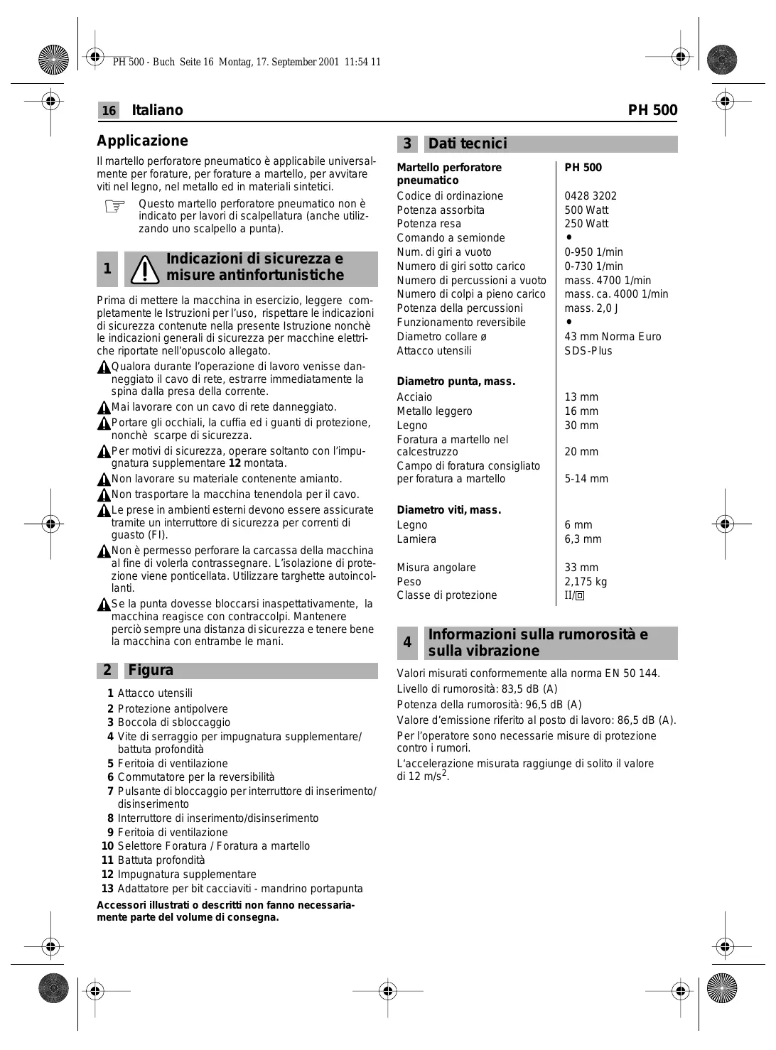 Informazioni sulla rumorosità e sulla vibrazione Valori misurati conformemente alla norma EN 50 144. Livello di rumorosità: 83,5 dB (A) Potenza della rumorosità: 96,5 dB (A) Valore d’emissione riferito al posto di lavoro: 86,5 dB (A). Per l’operatore sono necessarie misure di protezione contro i rumori. L‘accelerazione misurata raggiunge di solito il valore di 12 m/s2. PH 500 - Buch Seite 17 Montag, 17. September 2001 11:54 11 PH 500