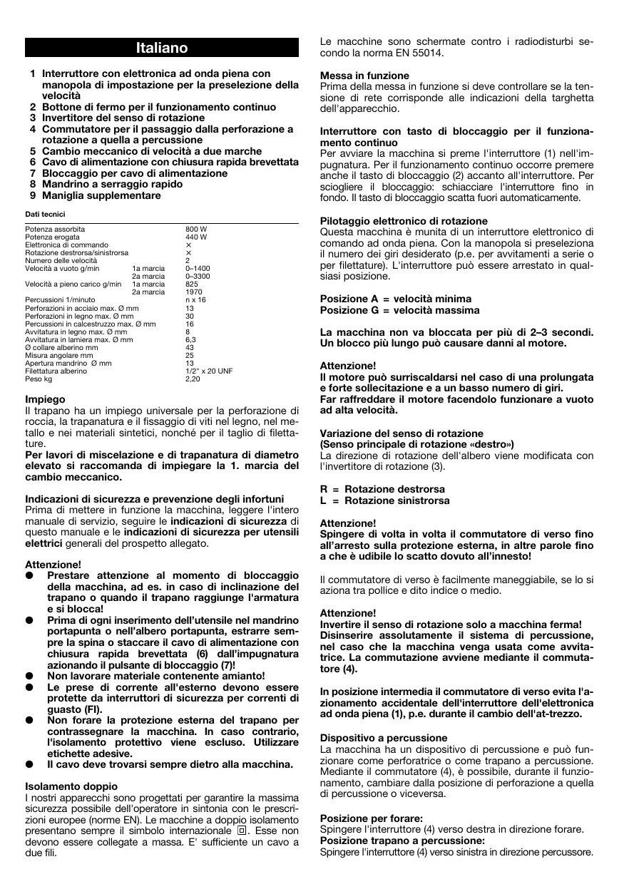 1/2" x 20 UNF 2,20 Impiego Il trapano ha un impiego universale per la perforazione di roccia, la trapanatura e il fissaggio di viti nel legno, nel metallo e nei materiali sintetici, nonché per il taglio di filettature. Per lavori di miscelazione e di trapanatura di diametro elevato si raccomanda di impiegare la 1. marcia del cambio meccanico. Indicazioni di sicurezza e prevenzione degli infortuni Prima di mettere in funzione la macchina, leggere l'intero manuale di servizio, seguire le indicazioni di sicurezza di questo manuale e le indicazioni di sicurezza per utensili elettrici generali del prospetto allegato. Attenzione! ● Prestare attenzione al momento di bloccaggio della macchina, ad es. in caso di inclinazione del trapano o quando il trapano raggiunge l'armatura e si blocca! ● Prima di ogni inserimento dell’utensile nel mandrino portapunta o nell’albero portapunta, estrarre sempre la spina o staccare il cavo di alimentazione con chiusura rapida brevettata (6) dall’impugnatura azionando il pulsante di bloccaggio (7)! ● Non lavorare materiale contenente amianto! ● Le prese di corrente all'esterno devono essere protette da interruttori di sicurezza per correnti di guasto (FI). ● Non forare la protezione esterna del trapano per contrassegnare la macchina. In caso contrario, l'isolamento protettivo viene escluso. Utilizzare etichette adesive. ● Il cavo deve trovarsi sempre dietro alla macchina. Isolamento doppio I nostri apparecchi sono progettati per garantire la massima sicurezza possibile dell'operatore in sintonia con le prescrizioni europee (norme EN). Le macchine a doppio isolamento presentano sempre il simbolo internazionale . Esse non devono essere collegate a massa. E' sufficiente un cavo a due fili. Interruttore con tasto di bloccaggio per il funzionamento continuo Per avviare la macchina si preme l'interruttore (1) nell'impugnatura. Per il funzionamento continuo occorre premere anche il tasto di bloccaggio (2) accanto all'interruttore. Per sciogliere il bloccaggio: schiacciare l'interruttore fino in fondo. Il tasto di bloccaggio scatta fuori automaticamente. Pilotaggio elettronico di rotazione Questa macchina è munita di un interruttore elettronico di comando ad onda piena. Con la manopola si preseleziona il numero dei giri desiderato (p.e. per avvitamenti a serie o per filettature). L'interruttore può essere arrestato in qualsiasi posizione. Posizione A = velocità minima Posizione G = velocità massima La macchina non va bloccata per più di 2–3 secondi. Un blocco più lungo può causare danni al motore. Attenzione! Il motore può surriscaldarsi nel caso di una prolungata e forte sollecitazione e a un basso numero di giri. Far raffreddare il motore facendolo funzionare a vuoto ad alta velocità. Variazione del senso di rotazione (Senso principale di rotazione «destro») La direzione di rotazione dell'albero viene modificata con l'invertitore di rotazione (3). R = Rotazione destrorsa L = Rotazione sinistrorsa Attenzione! Spingere di volta in volta il commutatore di verso fino all’arresto sulla protezione esterna, in altre parole fino a che è udibile lo scatto dovuto all’innesto! Il commutatore di verso è facilmente maneggiabile, se lo si aziona tra pollice e dito indice o medio. Attenzione! Invertire il senso di rotazione solo a macchina ferma! Disinserire assolutamente il sistema di percussione, nel caso che la macchina venga usata come avvitatrice. La commutazione avviene mediante il commutatore (4). In posizione intermedia il commutatore di verso evita l'azionamento accidentale dell'interruttore dell'elettronica ad onda piena (1), p.e. durante il cambio dell'at-trezzo. Dispositivo a percussione La macchina ha un dispositivo di percussione e può funzionare come perforatrice o come trapano a percussione. Mediante il commutatore (4), è possibile, durante il funzionamento, cambiare dalla posizione di perforazione a quella di percussione o viceversa. Posizione per forare: Spingere l'interruttore (4) verso destra in direzione forare. Posizione trapano a percussione: Spingere l'interruttore (4) verso sinistra in direzione percussore. Cambio meccanico a due rapporti La commutazione avviene girando la levetta rotante (5). Posizione 1 = Funzionamento lento Posizione 2 = Funzionamento rapido Il cambio a due rapporti fornisce dei vantaggi nella foratura normale e a martello con piccolo diametro di foratura (fino a ca. 8 mm). Cambio in posizione 2. Con un diametro di foratura maggiore e per lavori di agitazione, il cambio va in posizione 1. Giunto a frizione di sicurezza Il giunto di frizione entra in funzione nel momento in cui l'utensile serrato nella macchina viene sovraccaricato, frenato bruscamente o incastrato. Ciò provoca il blocco del utensile, mentre il motore e il riduttore continuano a girare. Il motore e il cambio sono protetti contro i sovraccarichi ed è escluso il passaggio brusco del carico sugli ingranaggi. Mandrino portapunta ll mandrino portapunta è serrato con una coppia di 30 Nm. Solo in questo modo si garantisce che esso, durante la rotazione sinistrorsa, non si sfili accidentalmente dall’albero portapunta. Se il mandrino portapunta deve essere svitato dall’albero portapunta per essere sostituito, il nuovo mandrino portapunta deve essere serrato con una coppia di almeno 30 Nm prima di utilizzare nuovamente la macchina. Prima del montaggio di un nuovo mandrino portapunta occorre pulire le superfici piane del mandrino portapunta e dell’albero portapunta. Attenzione! Prima dello smontaggio e del rimontaggio del mandrino, staccare la spina dell'alimentazione oppure estrarre il modulo del cavo d'alimentazione (6) dall'impugnatura agendo sul tasto di bloccaggio (7)! Attenzione! Non si può completamente escludere che il mandrino portapunta si allenti durante la rotazione sinistrorsa. Fare quindi attenzione che il mandrino portapunta alloggi perfettamente sull’albero portapunta. Uso del mandrino a serraggio rapido Questo mandrin
