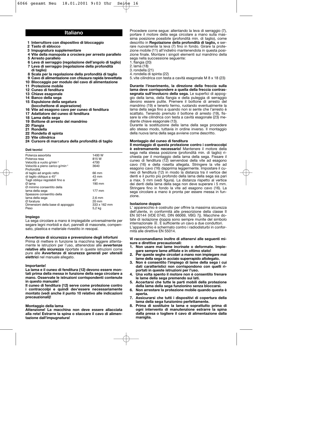 la macchina. L’isolamento di protezione viene in questo modo escluso. Servirsi invece di etichette. Messa in funzione Prima della messa in funzione, accertarsi che la tensione di rete corrisponda ai dati riportati sulla targhetta di costruzione dell’apparecchio. Interruttore di sicurezza con dispositivo di bloccaggio Prima di azionare l’interruttore (1) posto sull’impugnatura è necessario sbloccarlo premendo il tasto di sblocco (2). Solo a questo punto è possibile mettere in funzione la macchina premendo l’interruttore. Per ragioni di sicurezza non è possibile bloccare l’interruttore nella posizione di funzionamento permanente. Rilasciando l’interruttore viene interrotta l’alimentazione di corrente e la macchina si arresta. Il dispositivo di arresto blocca automatica- mente l’interruttore evitando così il pericolo di un’accensione involontaria della macchina. Motore Il potente motore universale dispone di sufficienti riserve di forza. Il raffreddamento è garantito da un ventilatore di grandi dimensioni. Il motore può surriscaldarsi nel caso di una prolungata sollecitazione elevata. Lasciare raffreddare il motore facendolo lo funzionare a vuoto! Impiegare sempre e soltanto delle lame in ottimo stato e ben affilate, impedendo così un surriscaldamento del motore. Pulizia e manutenzione Sarete ricompensati da un funzionamento duraturo del motore, se, dopo aver terminato ogni lavoro, soffierete via la polvere che si deposita nelle aperture di ventilazione situate sull'involucro. Per prolungare il funzionamento del motore è infatti indispensabile una costante ventilazione. Ripulite di tanto in tanto la bocchetta d'espulsione della segatura dai residui di resina (non usare solventi troppo forti), per preservarne la funzionalità. Il motore dell'apparecchio è provvisto di lubrificazione permanente e non richiede una manutenzione particolare. Nel caso che l'apparecchio venga sottoposto per lungo tempo a forti sollecitazioni, Vi consigliamo di farlo pulire a fondo e di farlo occasionalmente controllare da uno dei nostri servizi di assistenza. In questo modo, risparmierete gli inutili costi delle riparazioni e prolungherete il funzionamento della sega. Base di appoggio La base di appoggio (14) è montata in modo che nella posizione principale (posizione azzerata) l'angolo tra la base e la lama sia esattamente di 90°. La sospensione a quattro punti di appoggio garantisce un preciso lavoro. Protezione mobile La protezione mobile (11) che copre la lama, si sposta all'indietro con la stessa velocità della sega, non appena questa inizia a segare il pezzo da lavorare. A lavoro ultimato, la protezione mobile ritorna, tramite azionamento a molla, nella posizione di protezione. Regolazione della profondità di taglio È possibile regolare la profondità di taglio fino a 66 mm. Allentando la leva di serraggio (7) sulla scatola è possibile spingere verso il basso il banco della sega (14) regolando la profondità di taglio a partire dalla posizione «0». Sul cursore di marcatura (24) è possibile rilevare la profondità di taglio o regolarla in base alla scala. La profondità di taglio deve sempre essere regolata a seconda dello spessore del pezzo da lavorare, vale a dire, è consentito alla lama della sega di sporgere solo quel tanto che basta a lasciare scoperta la profondità di un dente. Importante per prevenire incidenti! Segare su tracciatura Il banco della sega circolare a mano è munito sullo spigolo anteriore di una marcatura (rientranza) per tagli ad angolo retto (posizione zero), equivalente alla larghezza della lama della sega. Inoltre sono previsti cursori di marcatura per tagli trasversali a 0° e 45°. In questo modo il lavoro viene facilitato e diventa più preciso. I cursori di marcatura sul banco della sega (vedi disegno) corrispondono ugualmente alla larghezza di taglio della lama della sega. Qualora si seghi seguendo la tracciatura, fare in modo di concentrarsi sullo spigolo destro o sinistro della rientranza o sul cursore di marcatura a seconda che venga segato a sinistra o a destra rispetto alla tracciatura. Arresto parallelo L'arresto parallelo è provvisto di una scala graduata che rende la regolazione semplicissima. Svitare la vite della 6066 gesamt Neu