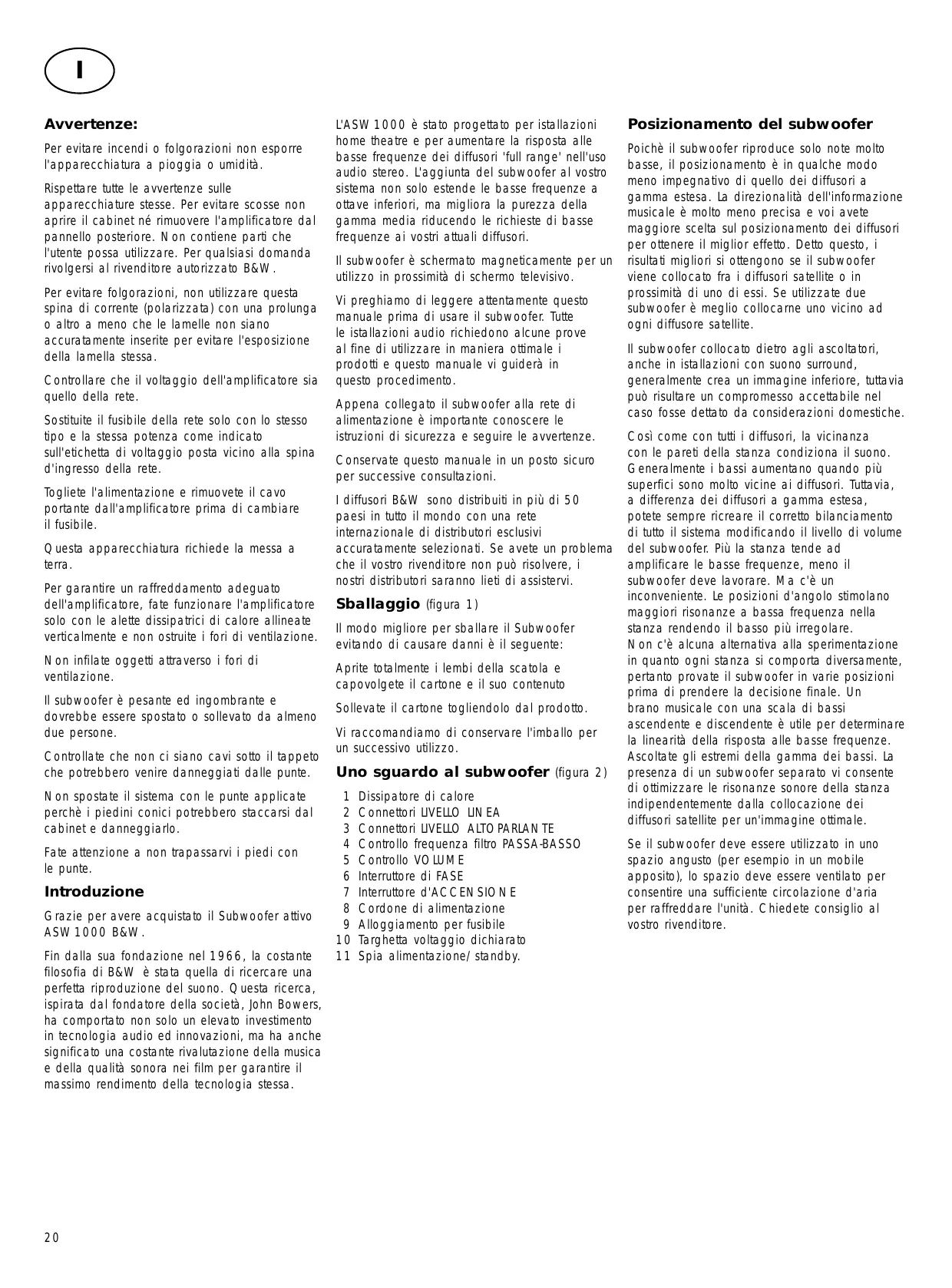 L'ASW1000 è stato progettato per istallazioni home theatre e per aumentare la risposta alle basse frequenze dei diffusori 'full range' nell'uso audio stereo. L'aggiunta del subwoofer al vostro sistema non solo estende le basse frequenze a ottave inferiori, ma migliora la purezza della gamma media riducendo le richieste di basse frequenze ai vostri attuali diffusori. Il subwoofer è schermato magneticamente per un utilizzo in prossimità di schermo televisivo. Vi preghiamo di leggere attentamente questo manuale prima di usare il subwoofer. Tutte le istallazioni audio richiedono alcune prove al fine di utilizzare in maniera ottimale i prodotti e questo manuale vi guiderà in questo procedimento. Appena collegato il subwoofer alla rete di alimentazione è importante conoscere le istruzioni di sicurezza e seguire le avvertenze. Conservate questo manuale in un posto sicuro per successive consultazioni. I diffusori B&W sono distribuiti in più di 50 paesi in tutto il mondo con una rete internazionale di distributori esclusivi accuratamente selezionati. Se avete un problema che il vostro rivenditore non può risolvere, i nostri distributori saranno lieti di assistervi.