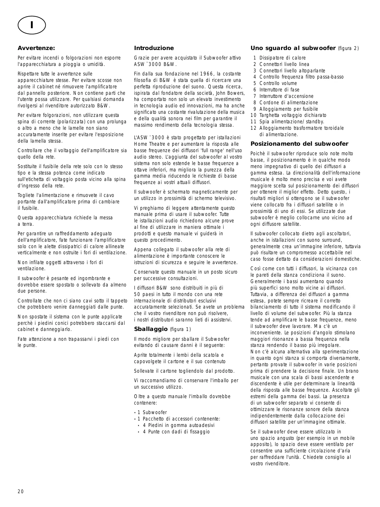 L'ASW™3000 è stato progettato per istallazioni Home Theatre e per aumentare la risposta alle basse frequenze dei diffusori 'full range' nell'uso audio stereo. L'aggiunta del subwoofer al vostro sistema non solo estende le basse frequenze a ottave inferiori, ma migliora la purezza della gamma media riducendo le richieste di basse frequenze ai vostri attuali diffusori. Il subwoofer è schermato magneticamente per un utilizzo in prossimità di schermo televisivo. Vi preghiamo di leggere attentamente questo manuale prima di usare il subwoofer. Tutte le istallazioni audio richiedono alcune prove al fine di utilizzare in maniera ottimale i prodotti e questo manuale vi guiderà in questo procedimento. Appena collegato il subwoofer alla rete di alimentazione è importante conoscere le istruzioni di sicurezza e seguire le avvertenze. Conservate questo manuale in un posto sicuro per successive consultazioni. I diffusori B&W sono distribuiti in più di 50 paesi in tutto il mondo con una rete internazionale di distributori esclusivi accuratamente selezionati. Se avete un problema che il vostro rivenditore non può risolvere, i nostri distributori saranno lieti di assistervi.