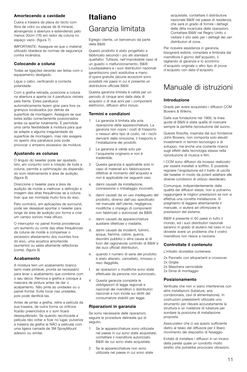 Le châssis est recouvert d’une peinture semi-mate, prête à recevoir une peinture de finition adaptée à votre décoration. Retirez la grille, et utilisez le masque de protection pour peinture fourni avant de peindre. Ne B&W no ha sido sino la búsqueda continua de la perfecta reproducción sonora. Inspirada por el fundador de la compañía, el ya desaparecido John Bowers, esta búsqueda ha supuesto no sólo una elevada inversión en tecnología e innovación aplicadas al mundo del audio sino también una permanente apreciación de todo tipo de grabaciones musicales y audiovisuales con el fin de garantizar que los recursos utilizados se exploten al máximo. Estas cajas acústicas CCM han sido diseñadas para ser empotradas en techos. Incorporan un ajuste para la inclinación del tweeter y otro para regular el nivel de volumen del mismo para que sus prestaciones puedan adaptarse a una extensa variedad de condiciones de funcionamiento prácticas. Sin embargo, las CCM no rendirán –independientemente de su calidad intrínseca– al cien por cien de sus posibilidades a menos que sean instaladas adecuadamente. En consecuencia, le rogamos que lea atentamente la totalidad del presente manual ya que ello le ayudará a optimizar las prestaciones del sistema. B&W distribuye sus productos en más de 60 países repartidos por todo el mundo y mantiene una red de importadores altamente motivados que podrán ayudarle en el caso de que se produzca algún problema que no pueda resuelto por su distribuidor especializado.