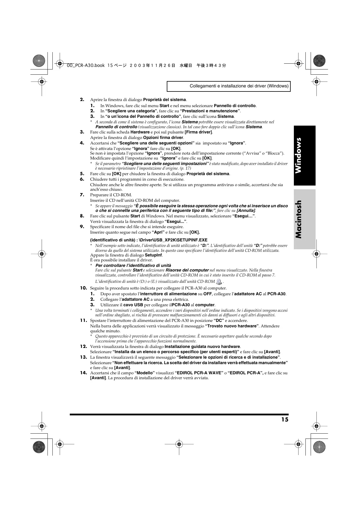- Se si utilizza Windows XP Professional, è necessario collegarsi con un nome utente dotato di privilegi amministrativi, ad esempio come Administrator. Per maggiori informazioni sugli account degli utenti, contattare l’amministratore del sistema. 00_PCR-A30.book 15 ページ 2003年11月26日