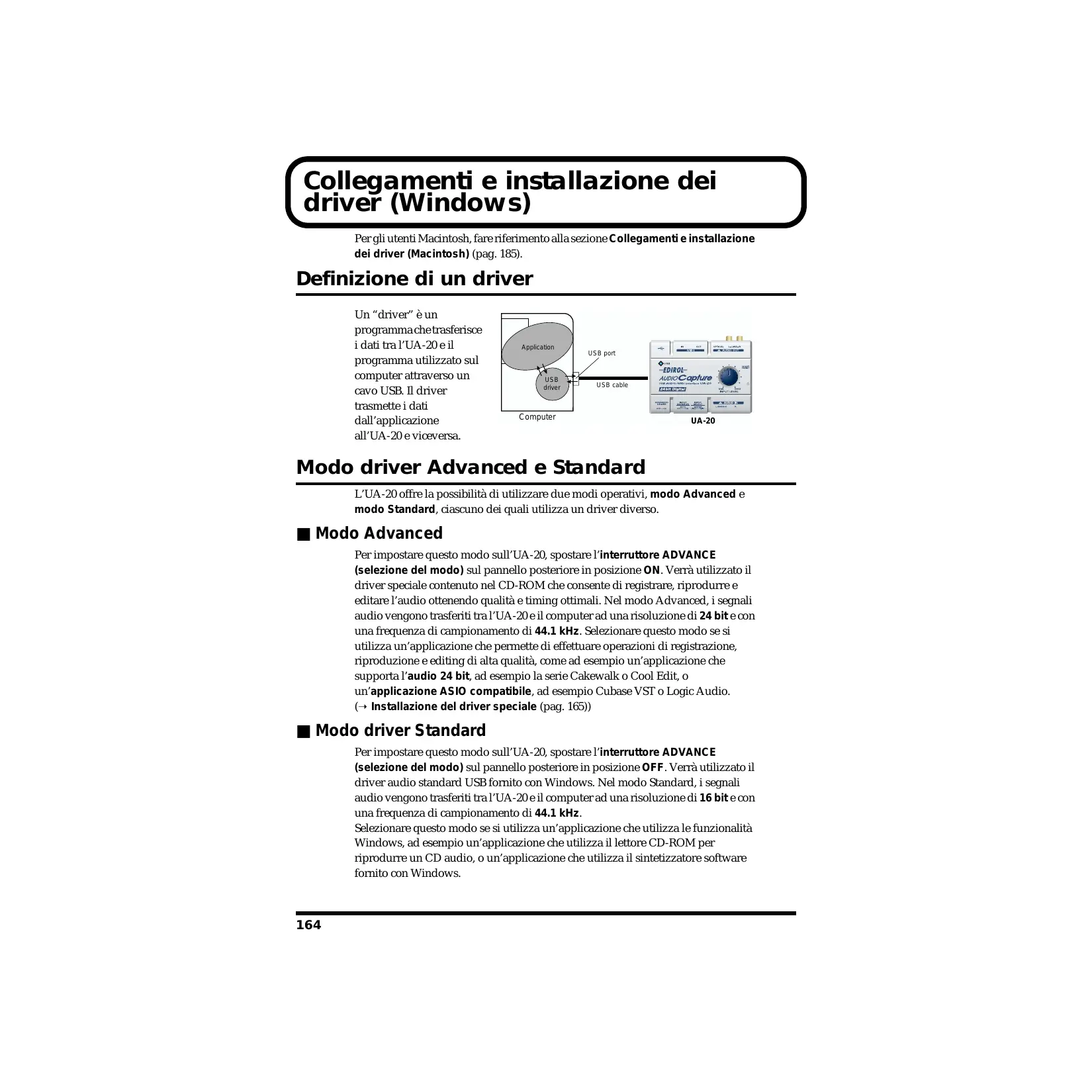 Collegamenti e installazione dei driver (Windows) Per gli utenti Macintosh, fare riferimento alla sezione Collegamenti e installazione dei driver (Macintosh) (pag. 185). Definizione di un driver fig.05-1e_50 Un “driver” è un programma che trasferisce i dati tra l’UA-20 e il programma utilizzato sul computer attraverso un cavo USB. Il driver trasmette i dati dall’applicazione all’UA-20 e viceversa. Application USB port USB driver USB cable Computer UA-20 Modo driver Advanced e Standard L’UA-20 offre la possibilità di utilizzare due modi operativi, modo Advanced e modo Standard, ciascuno dei quali utilizza un driver diverso. ■ Modo Advanced Per impostare questo modo sull’UA-20, spostare l’interruttore ADVANCE (selezione del modo) sul pannello posteriore in posizione ON. Verrà utilizzato il driver speciale contenuto nel CD-ROM che consente di registrare, riprodurre e editare l’audio ottenendo qualità e timing ottimali. Nel modo Advanced, i segnali audio vengono trasferiti tra l’UA-20 e il computer ad una risoluzione di 24 bit e con una frequenza di campionamento di 44.1 kHz. Selezionare questo modo se si utilizza un’applicazione che permette di effettuare operazioni di registrazione, riproduzione e editing di alta qualità, come ad esempio un’applicazione che supporta l’audio 24 bit, ad esempio la serie Cakewalk o Cool Edit, o un’applicazione ASIO compatibile, ad esempio Cubase VST o Logic Audio. (➝ Installazione del driver speciale (pag. 165)) ■ Modo driver Standard Per impostare questo modo sull’UA-20, spostare l’interruttore ADVANCE (selezione del modo) sul pannello posteriore in posizione OFF. Verrà utilizzato il driver audio standard USB fornito con Windows. Nel modo Standard, i segnali audio vengono trasferiti tra l’UA-20 e il computer ad una risoluzione di 16 bit e con una frequenza di campionamento di 44.1 kHz. Selezionare questo modo se si utilizza un’applicazione che utilizza le funzionalità Windows, ad esempio un’applicazione che utilizza il lettore CD-ROM per riprodurre un CD audio, o un’applicazione che utilizza il sintetizzatore software fornito con Windows.