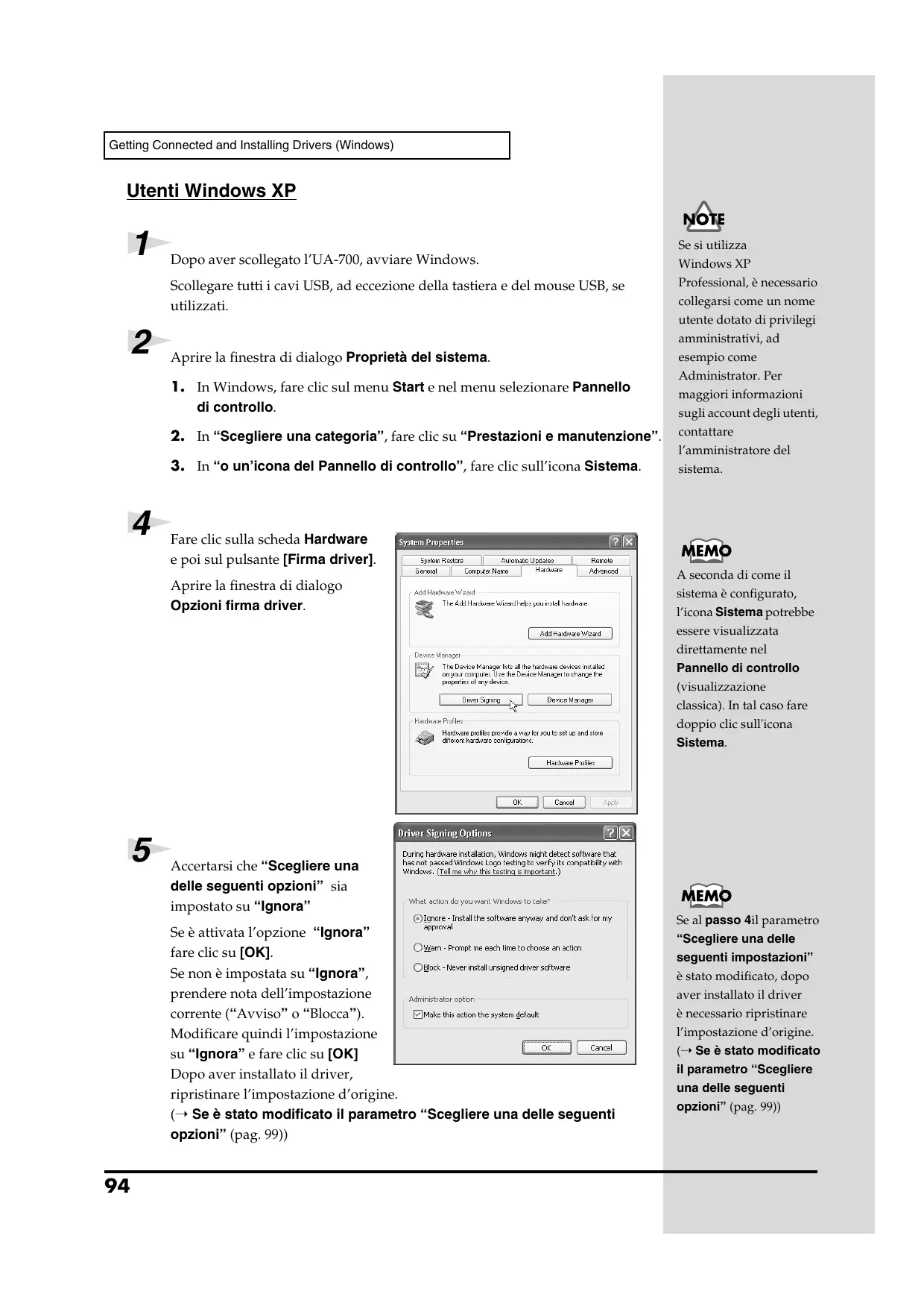 Se al passo 4il parametro “Scegliere una delle seguenti impostazioni” è stato modificato, dopo aver installato il driver è necessario ripristinare l’impostazione d’origine. (➝ Se è stato modificato il parametro “Scegliere una delle seguenti opzioni” (pag. 99)) Getting Connected and Installing Drivers (Windows) Fare clic su [OK] per chiudere la finestra di dialogo Proprietà del sistema. Chiudere tutti i programmi in corso di esecuzione. Preparare il CD-ROM. Inserire il CD nell’unità CD-ROM del computer. Fare clic sul pulsante Start di Windows. Nel menu visualizzato, selezionare “Esegui”. Aprire la finestra di dialogo “Esegui...”. fig.2-3_30 10 Nella finestra di dialogo che appare, immettere quanto segue nel campo “Apri” e fare clic su [OK]. D:\Driver\USB_XP2K\WDM\SETUPINF.EXE L’identificativo dell’unità “D:” potrebbe essere diverso da quello del sistema utilizzato. In questo caso specificare il nome dell’unità CD-ROM utilizzata. fig.2-4_30 11 Appare la finestra di dialogo SetupInf. È ora possibile installare il driver. Se si utilizza il driver MME, immettere MME invece di WDM. In questo manuale, la posizione delle cartelle e dei file è indicata nel percorso del file utilizzando il carattere \ come delimitatore. Ad esempio, USB_XP2K\SETUPINF. EXE indica che il file Setupinf.exe si trova nella cartella USB_XP2K.