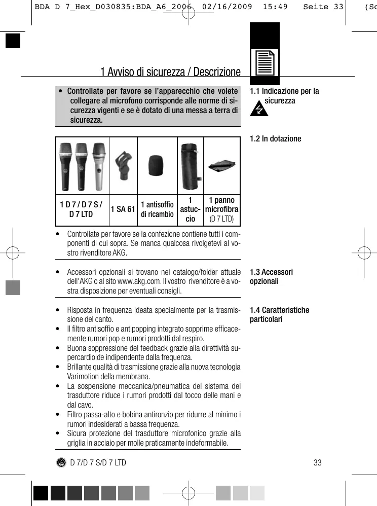 Scarica le istruzioni per il tuo Microfono in formato PDF gratuitamente! Trova il tuo manuale D7 S - AKG e riprendi in mano il tuo dispositivo elettronico. In questa pagina sono pubblicati tutti i documenti necessari per l'utilizzo del tuo dispositivo. D7 S del marchio AKG.