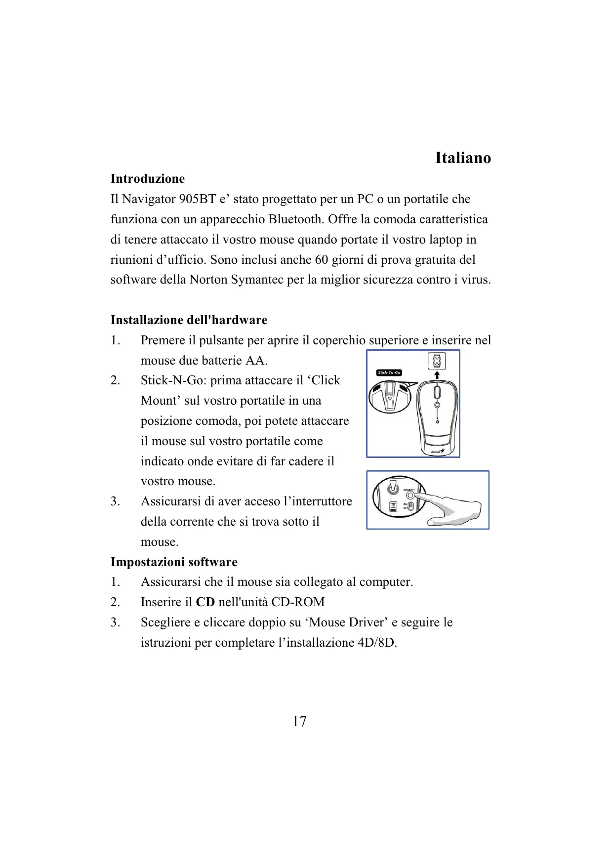 Italiano Introduzione Il Navigator 905BT e’ stato progettato per un PC o un portatile che funziona con un apparecchio Bluetooth. Offre la comoda caratteristica di tenere attaccato il vostro mouse quando portate il vostro laptop in riunioni d’ufficio. Sono inclusi anche 60 giorni di prova gratuita del software della Norton Symantec per la miglior sicurezza contro i virus. Installazione dell'hardware