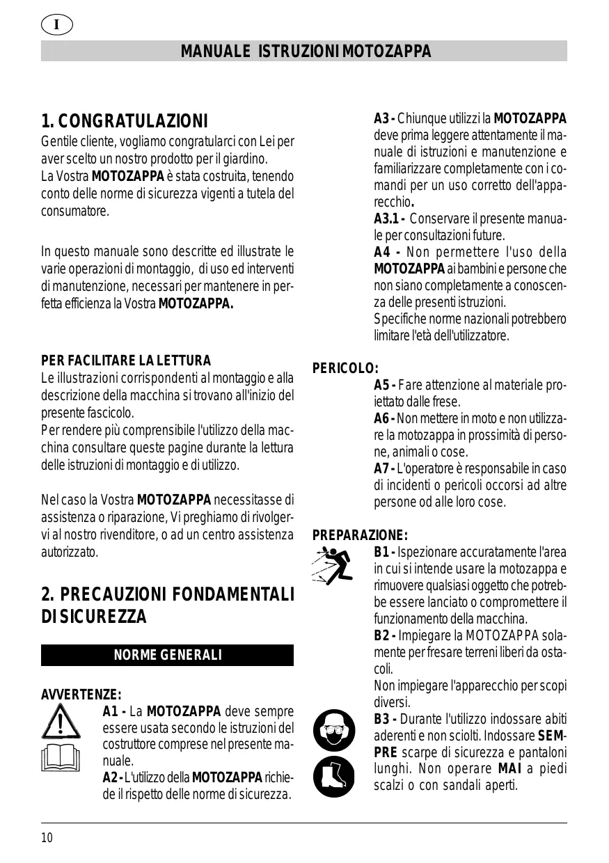 2. PRECAUZIONI FONDAMENTALI DI SICUREZZA NORME GENERALI AVVERTENZE: A1 - La MOTOZAPPA deve sempre essere usata secondo le istruzioni del costruttore comprese nel presente manuale. A2 - L'utilizzo della MOTOZAPPA richiede il rispetto delle norme di sicurezza. 10