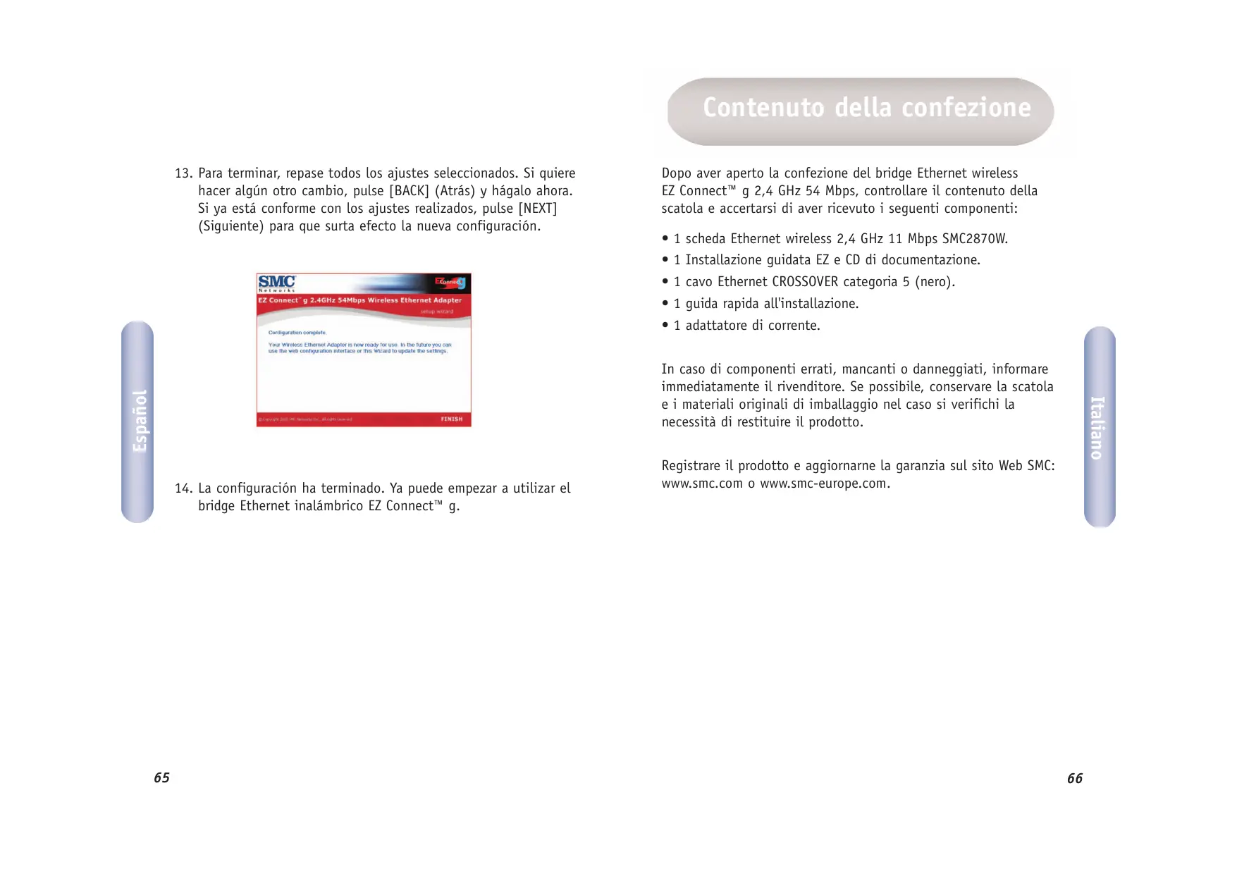 SMC2870W 2,4 GHz 54 Mbit/s Trådlös Ethernet-adapter CD med EZ Installationsguide och dokumentation. CAT-5 CROSSOVER Ethernet-kabel (svart). snabbinstallationsguide. nätadapter. Italiano
