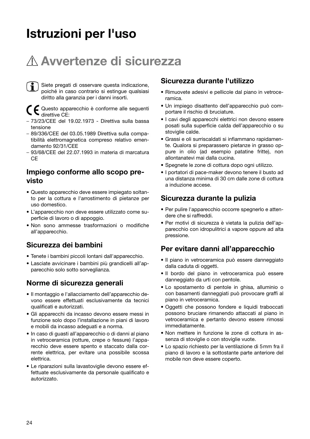 - Gli apparecchi da incasso devono essere messi in funzione solo dopo l'installazione in piani di lavoro e mobili da incasso adeguati e a norma.