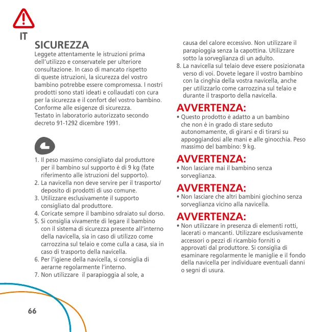 SICUREZZA Leggete attentamente le istruzioni prima dell’utilizzo e conservatele per ulteriore consultazione. In caso di mancato rispetto di queste istruzioni, la sicurezza del vostro bambino potrebbe essere compromessa. I nostri prodotti sono stati ideati e collaudati con cura per la sicurezza e il confort del vostro bambino. Conforme alle esigenze di sicurezza. Testato in laboratorio autorizzato secondo decreto 91-1292 dicembre 1991.