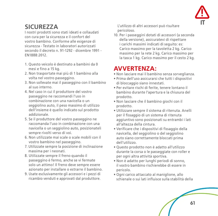er i passeggini dotati di accessori (a seconda della versione), assicuratevi di rispettare i carichi massimi indicati di seguito: es: Carico massimo per la tavoletta 2 kg. Carico massimo per la rete 2 kg. Carico massimo per la tasca 1 kg. Carico massimo per il cesto 2 kg. AVVERTENZA: