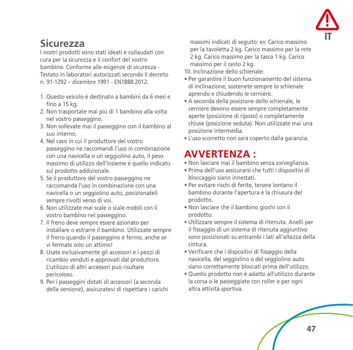 I nostri prodotti sono stati ideati e collaudati con cura per la sicurezza e il confort del vostro bambino. Conforme alle esigenze di sicurezza Testato in laboratori autorizzati secondo il decreto n. 91-1292 – dicembre 1991 - EN1888:2012. 1. Questo veicolo è destinato a bambini da 6 mesi e fino a 15 kg. 2. Non trasportate mai più di 1 bambino alla volta nel vostro passeggino. 3. Non sollevate mai il passeggino con il bambino al suo interno. 4. Nel caso in cui il produttore del vostro passeggino ne raccomandi l’uso in combinazione con una navicella o un seggiolino auto, il peso massimo di utilizzo dell’insieme è quello indicato sul prodotto addizionale. 5. Se il produttore del vostro passeggino ne raccomanda l’uso in combinazione con una navicella o un seggiolino auto, posizionateli sempre rivolti verso di voi. 6. Non utilizzate mai scale o scale mobili con il vostro bambino nel passeggino. 7. Il freno deve sempre essere azionato per installare o estrarre il bambino. Utilizzate sempre il freno quando il passeggino è fermo, anche se vi fermate solo un attimo! 8. Usate esclusivamente gli accessori e i pezzi di ricambio venduti e approvati dal produttore. L’utilizzo di altri accessori può risultare pericoloso. 9. Per i passeggini dotati di accessori (a seconda della versione), assicuratevi di rispettare i carichi
