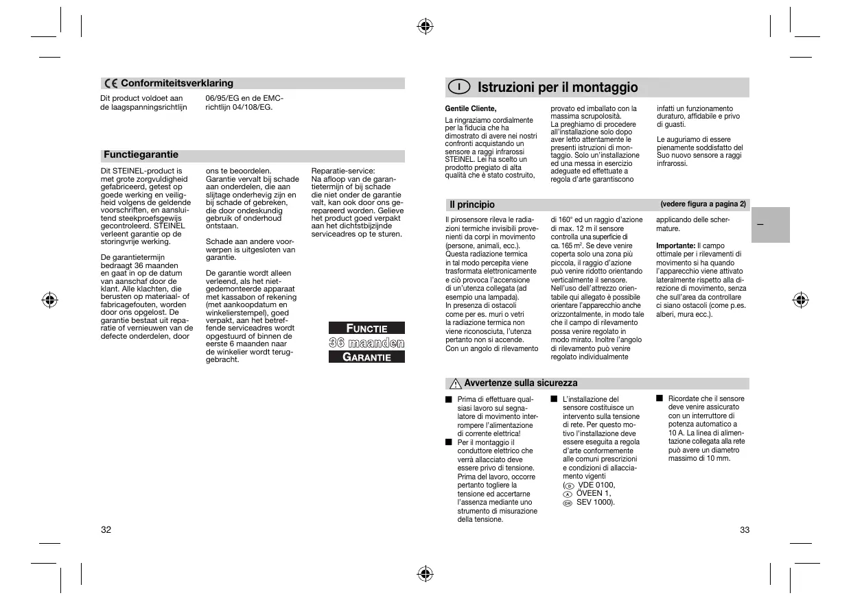 OBSSCE et à directe Service après-vente et garantie Ce produit STEINEL a été La garanti ne s'applique ni fabriqué avec le pus aux pièces d'usure, naux Son, Son fonciomiment et dommages et éfaLs us à Sa sécurité ot té contrée une utliation ou maine-nan- Suvant des procédures la” co incomectes. bles ea 8l soumis à un gone fnalpar sondage. Les dommages consécuis STEEL garant un état et causés à d'autres objet sont un fonctionnement imépr EXC dela garant, La durée de garanti est de La garantiene s'applique que Sms ct dfbue aupu de appel no does la vente au consommateur. retourné au point de service Nous remécions aux défauts apres veniee ps proche, provenant d'un vice de ma. dans un embalage adéqua. Fe ou de consructen Lage- accompagné d'u lciie ou ranbe era assurée à noie d'un che de casse porant Garon parréparaion ou [a date d'achai etie cache du échange des pièces défec- vendeur ou s'i est remis lues Au vendeur das les 8 pre rer mo de La garanti. ds