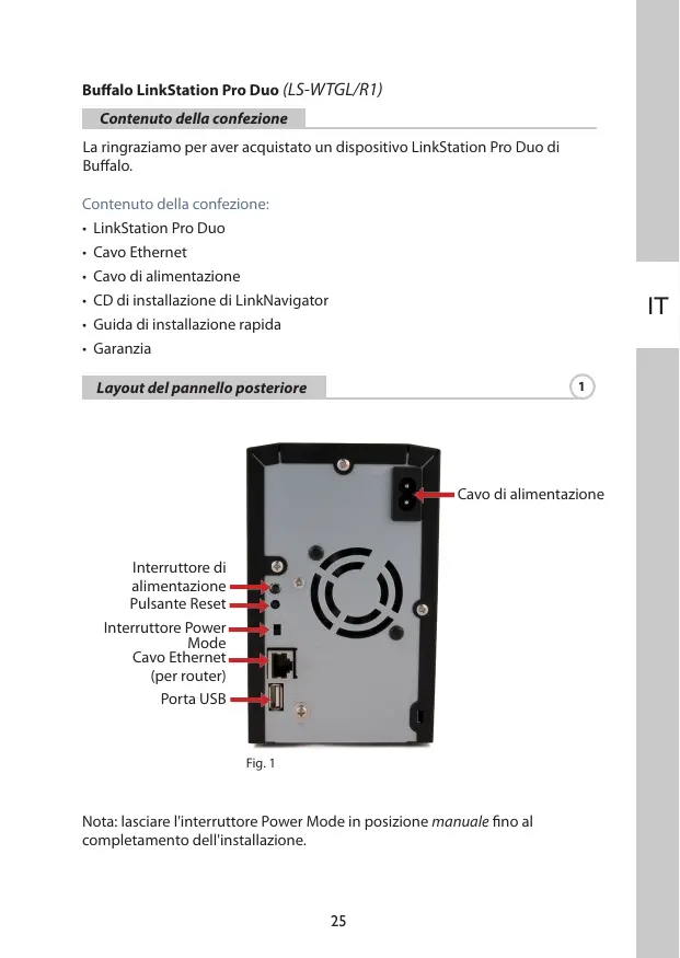 Buffalo LinkStation Pro Duo (LS-WTGL/R1) Contenuto della confezione La ringraziamo per aver acquistato un dispositivo LinkStation Pro Duo di Buffalo. Contenuto della confezione: • LinkStation Pro Duo • Cavo Ethernet • Cavo di alimentazione • CD di installazione di LinkNavigator