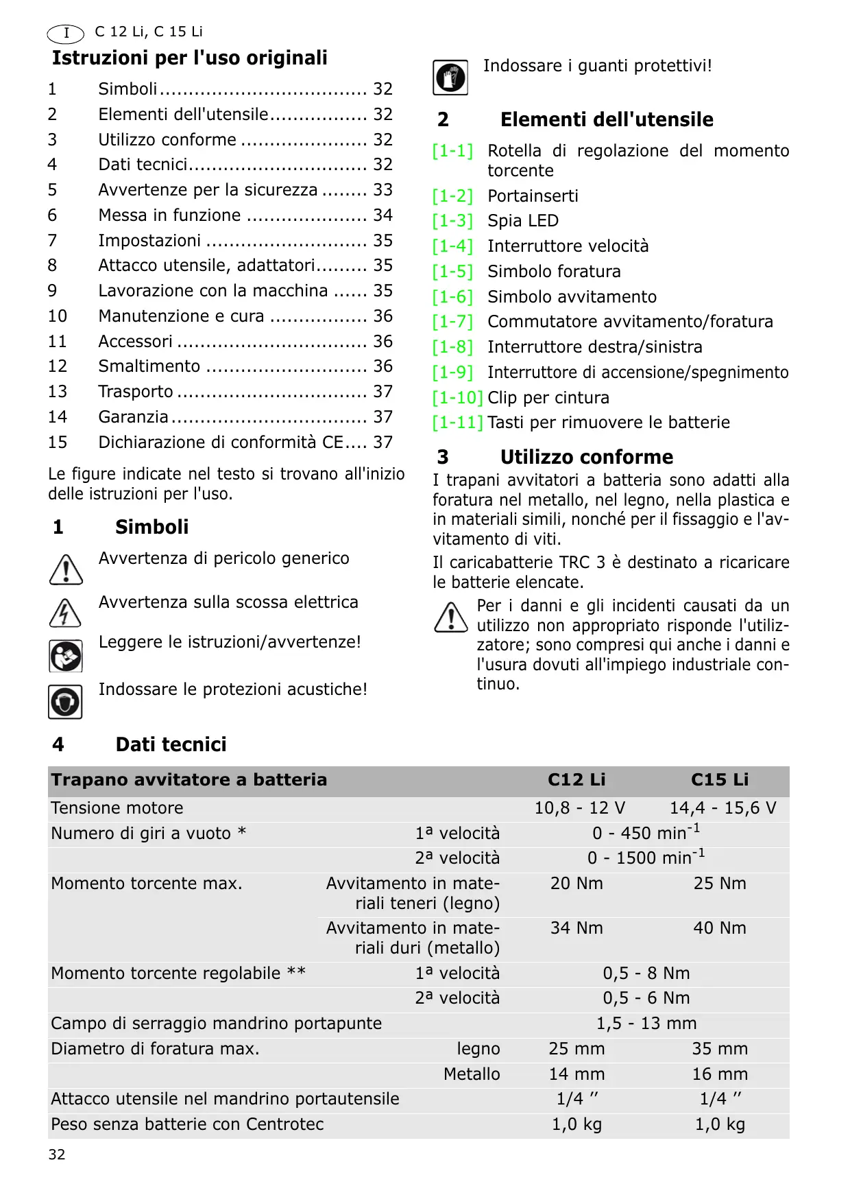 Elementi dell'utensile Utilizzo conforme I trapani avvitatori a batteria sono adatti alla foratura nel metallo, nel legno, nella plastica e in materiali simili, nonché per il fissaggio e l'avvitamento di viti. Il caricabatterie TRC 3 è destinato a ricaricare le batterie elencate. Per i danni e gli incidenti causati da un utilizzo non appropriato risponde l'utilizzatore; sono compresi qui anche i danni e l'usura dovuti all'impiego industriale continuo. Dati tecnici Trapano avvitatore a batteria Tensione motore Numero di giri a vuoto * Momento torcente max. C12 Li 1ª velocità 2ª velocità Avvitamento in materiali teneri (legno) Avvitamento in materiali duri (metallo) Momento torcente regolabile ** Campo di serraggio mandrino portapunte Diametro di foratura max. C15 Li 10,8 - 12 V 14,4 - 15,6 V