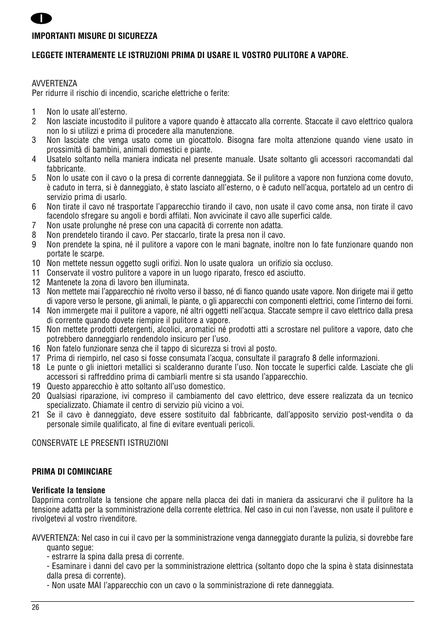 2 Non lasciate incustodito il pulitore a vapore quando è attaccato alla corrente. Staccate il cavo elettrico qualora non lo si utilizi e prima di procedere alla manutenzione.