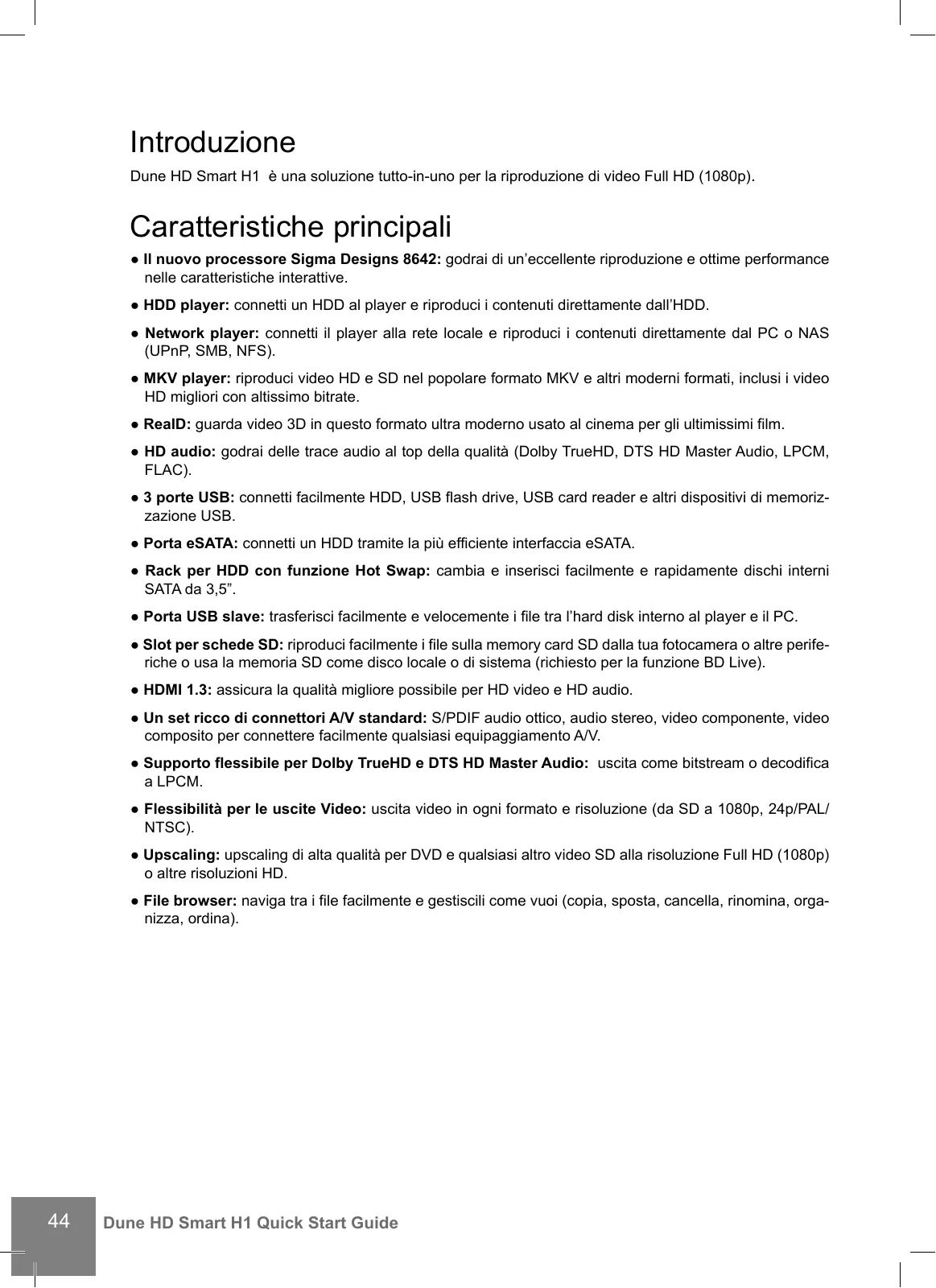 Introduzione Dune HD Smart H1 è una soluzione tutto-in-uno per la riproduzione di video Full HD (1080p). Caratteristiche principali ● Il nuovo processore Sigma Designs 8642: godrai di un’eccellente riproduzione e ottime performance nelle caratteristiche interattive. ● HDD player: connetti un HDD al player e riproduci i contenuti direttamente dall’HDD. ● Network player: connetti il player alla rete locale e riproduci i contenuti direttamente dal PC o NAS (UPnP, SMB, NFS). ● MKV player: riproduci video HD e SD nel popolare formato MKV e altri moderni formati, inclusi i video HD migliori con altissimo bitrate. ● RealD: guarda video 3D in questo formato ultra moderno usato al cinema per gli ultimissimi film. ● HD audio: godrai delle trace audio al top della qualità (Dolby TrueHD, DTS HD Master Audio, LPCM, FLAC). ● 3 porte USB: connetti facilmente HDD, USB flash drive, USB card reader e altri dispositivi di memorizzazione USB. ● Porta eSATA: connetti un HDD tramite la più efficiente interfaccia eSATA. ● Rack per HDD con funzione Hot Swap: cambia e inserisci facilmente e rapidamente dischi interni SATA da 3,5”. ● Porta USB slave: trasferisci facilmente e velocemente i file tra l’hard disk interno al player e il PC. ● Slot per schede SD: riproduci facilmente i file sulla memory card SD dalla tua fotocamera o altre periferiche o usa la memoria SD come disco locale o di sistema (richiesto per la funzione BD Live). ● HDMI 1.3: assicura la qualità migliore possibile per HD video e HD audio. ● Un set ricco di connettori A/V standard: S/PDIF audio ottico, audio stereo, video componente, video composito per connettere facilmente qualsiasi equipaggiamento A/V. ● Supporto flessibile per Dolby TrueHD e DTS HD Master Audio: uscita come bitstream o decodifica a LPCM. ● Flessibilità per le uscite Video: uscita video in ogni formato e risoluzione (da SD a 1080p, 24p/PAL/ NTSC). ● Upscaling: upscaling di alta qualità per DVD e qualsiasi altro video SD alla risoluzione Full HD (1080p) o altre risoluzioni HD. ● File browser: naviga tra i file facilmente e gestiscili come vuoi (copia, sposta, cancella, rinomina, organizza, ordina).