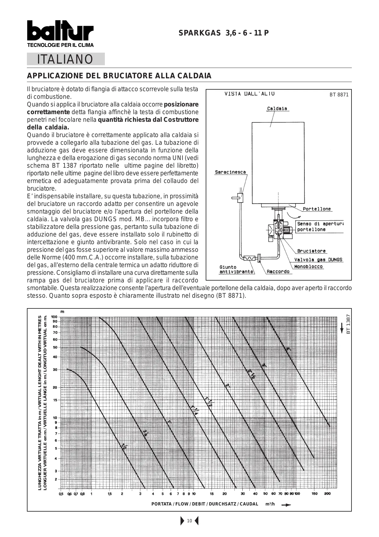 LUNGHEZZA VIRTUALE TRATTA in m / VIRTUAL LENGHT DEALT WITH IN METRES LONGUER VIRTUELLE en m / VIRTUELLE LÄNGE in m / LONGITUD VIRTUAL en m. BT 1387 Il bruciatore è dotato di flangia di attacco scorrevole sulla testa BT 8871 di combustione. Quando si applica il bruciatore alla caldaia occorre posizionare correttamente detta flangia affinchè la testa di combustione penetri nel focolare nella quantità richiesta dal Costruttore della caldaia. Quando il bruciatore è correttamente applicato alla caldaia si provvede a collegarlo alla tubazione del gas. La tubazione di adduzione gas deve essere dimensionata in funzione della lunghezza e della erogazione di gas secondo norma UNI (vedi schema BT 1387 riportato nelle ultime pagine del libretto) riportato nelle ultime pagine del libro deve essere perfettamente ermetica ed adeguatamente provata prima del collaudo del bruciatore. E’ indispensabile installare, su questa tubazione, in prossimità del bruciatore un raccordo adatto per consentire un agevole smontaggio del bruciatore e/o l’apertura del portellone della caldaia. La valvola gas DUNGS mod. MB... incorpora filtro e stabilizzatore della pressione gas, pertanto sulla tubazione di adduzione del gas, deve essere installato solo il rubinetto di intercettazione e giunto antivibrante. Solo nel caso in cui la pressione del gas fosse superiore al valore massimo ammesso delle Norme (400 mm.C.A.) occorre installare, sulla tubazione del gas, all’esterno della centrale termica un adatto riduttore di pressione. Consigliamo di installare una curva direttamente sulla rampa gas del bruciatore prima di applicare il raccordo smontabile. Questa realizzazione consente l’apertura dell’eventuale portellone della caldaia, dopo aver aperto il raccordo stesso. Quanto sopra esposto è chiaramente illustrato nel disegno (BT 8871).