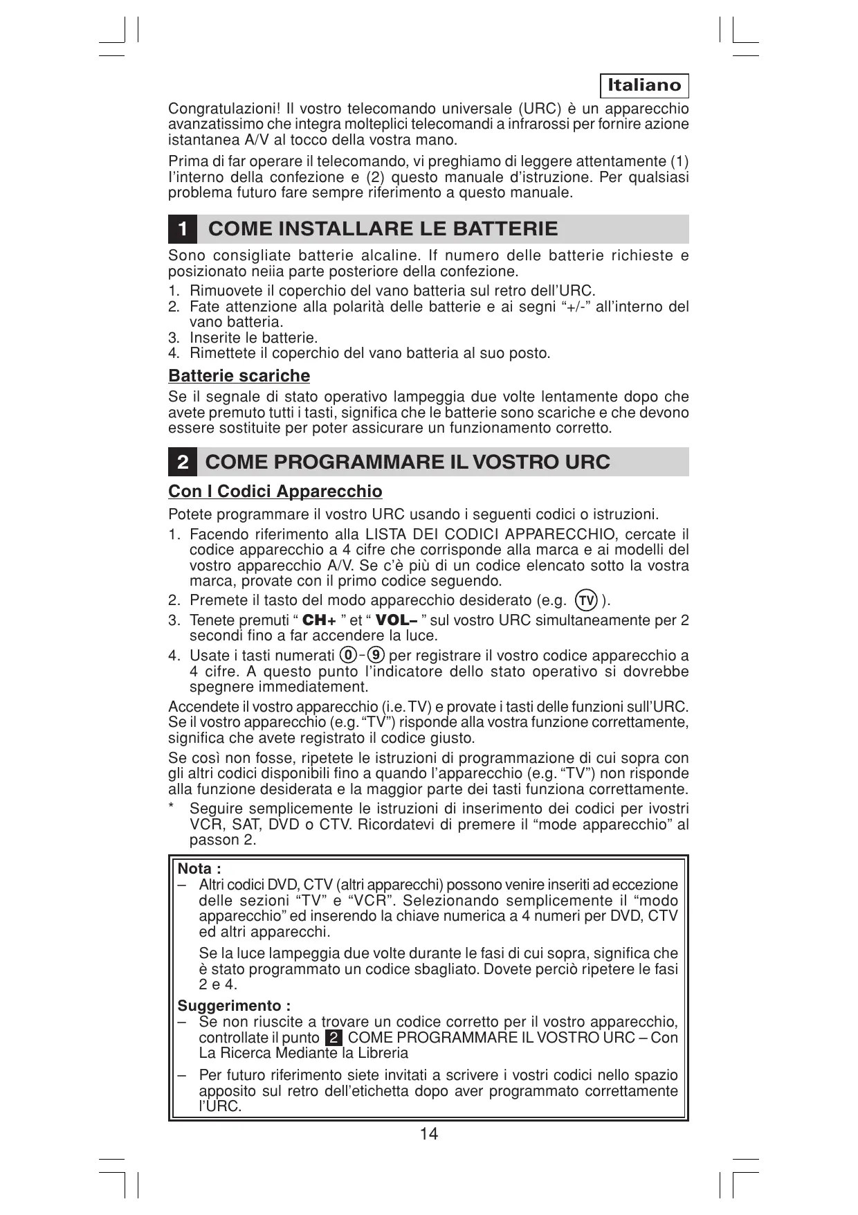 D. Il mio URC non funziona! R. Controlli l’apparecchio A/V. Se l’interuttore dell’apparecchio è spento, l’URC non può funzionare. R. Controlli se le batterie sono inserite correttamente e seguono la giusta polarità R. Controllate a questo punto di aver inserito l’esatto codice per l’apparecchio. R. Se le batterie sono scariche, le sostituisca. D. Se ci sono molti codici apparecchio elencati sotto la marca del mio apparecchio A/V, come posso selezionare il giusto codice apparecchio? R. Per cercare il corretto codice per l’apparecchio A/V, provi i codici uno dopo l’altro fino a quando tutti i tasti funzionano nel modo giusto. D. Il mio apparecchio A/V risponde solo ad alcuni dei comandi. R. Ha selezionato un codice per cui solo alcuni dei comandi funzionano correttamente e altri no. Provi altri codici fino a quando la maggior parte dei tasti non funziona bene. NOTA : In caso ci siano differenze tra la versione del testo in Inglese con quella in Italiano, il testo in Inglese prevale a tutti gli effetti.