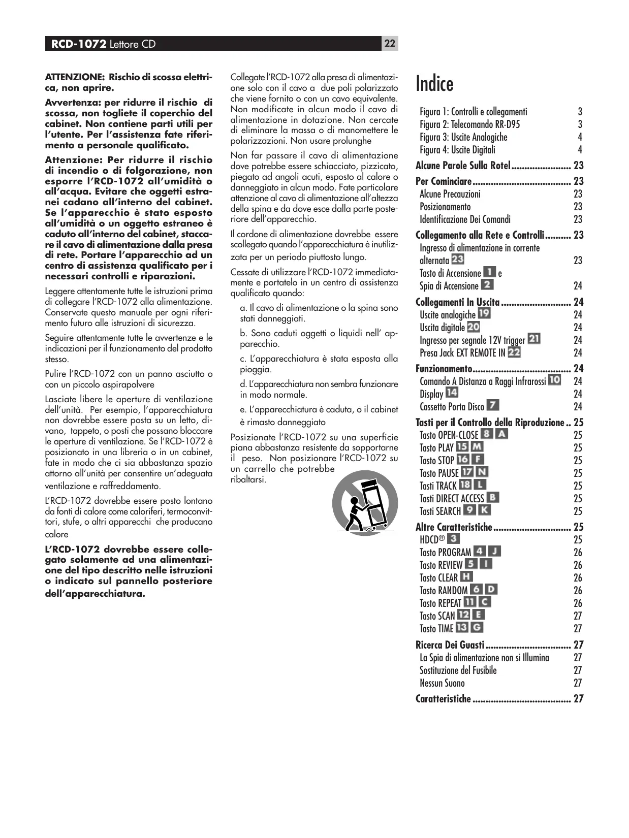 RCD-1072 Lettore CI 22 ATTENZIONE: Rischio di scossa elettri- ca, non aprire. Avvertenza: per cabinet. Non contiene parti utili per l’utente. Per l’assistenza fate riferi- mento a personale qualificato. Attenzione: Per ridurre il rischio di incendio o esporre l’RCD: all’acqua. Evitare che oggetti estra- nei cadano all’interno del cabinet. Se l’apparecchio è stato esposto all’umidità o un oggetto estraneo à caduto all’interno del cabinet, stacca- re il cavo di alimentazione dalla presa di rete. Portare l'apparecchio ad un centro di assistenza qualificato per i necessari controlli e riparazioni. Leggere attentamente tutte le istruzioni prima di collegare l'RCD-1072 alla alimentazione. Conservate questo manuale per ogni riferi- mento futuro alle istruzioni di sicurezza. Seguire attentamente tutte le avvertenze e le indicazioni per il funzionamento del prodotto stesso. Pulire l'RCD-1072 con un panno asciutto o con un piccolo aspirapolvere Lasciate libere le aperture di ventilazione dell’unità. Per esempio, l'apparecchiatura non dovrebbe essere posta su un letto, di- vano, tappeto, o posti che possano bloccare le aperture di ventilazione. Se l'RCD-1072 à posizionato in una libreria o in un cabinet, fate in modo che ci sia abbastanza spazio attorno all’unità per consentire un'adeguata ventilazione e raffreddamento. L'RCD-1072 dovrebbe essere posto lontano da fonti di calore come caloriferi, termoconvit- tori, stufe, o altri apparecchi che producano calore L'RCD-1072 dovrebbe essere colle- gato solamente ad una alimenta one del tipo descritto nelle istruzioni © indicato sul pannello posteriore dell’apparecchiatura. Collegate l'RCD-1072 alla presa di alimentazi- one solo con il cavo a due poli polarizzato che viene fornito o con un cavo equivalente. Non modificate in alcun modo il cavo di alimentazione in dotazione. Non cercate di eliminare la massa o di manomettere le polarizzazioni, Non usare prolunghe Non far passare il cavo di alimentazione dove potrebbe essere schiacciato, pizzicato, piegato ad angoli au, esposto al calore o danneggiato in aleun modo. Fate particolare attenzione al cavo di alimentazione al/altezza della spina e da dove esce dalla parte poste- riore del’apparecchio. Il cordone di alimentazione dovrebbe essere scollegato quand l'apparecchiatura à inutiliz- zata per un periodo piuttosto lungo. Cessate di utilizzare l'RCD-1072 immediata- mente e portatelo in un centro di assistenza qualificato quando: a. Il cavo di alimentazione o la spina sono stati danneggiati. b. Sono caduti oggeti o liquidi nell’ ap- parecchio. c. L'apparecchiatura à stata esposta alla pioggia. d. L'apparecchiatura non sembra funzionare in modo normale. e. l'apparecchiatura à caduta, o il cabinet à rimasto danneggiato Posizionate l'RCD-1072 su una superficie piana abbastanza resistente da sopportarne il peso. Non posizionare l'RCD-1072 su un carrello che potrebbe ribaltarsi. Indice Figura 1: Controlli e collegamenti Figura 2: Telecomando RR-D95 Figura 3: Uscite Analogiche Figura 4: Uscite Digitali Aleune Parole Sulla Rotel.… Per Cominciar Alcune Precauzioni Posizionamento Identificazione Dei Comandi Collegamento alla Rete e Controlli Ingresso di alimentazione in corrente alternata EE] 23 Tusto di Accensione EM e Spia di Accensione EX 24 Collegamenti In Uscita … Uscite analogiche Uscta digitale EX] Ingresso per segnale 12V trigger 21] 24 Presa Jack EXT REMOTE IN £#] 24 Funzionamento. Comando À Distanza a Raggi Infrarossi 24 Display LE] 24 Cassetto Porta Disco EX 24 Tasti per il Controllo della Riproduzione .. 25 Tusto OPEN-CLOSE ER EN Tusto PLAY EI LI Tusto ST0P LA KA Tusto PAUSE LE4 EI Tusti TRACK ÊEJ EN Tusti DIRECT ACCESS ER Tusti SEARCH EX CA Altre Caratteristiche … #oco® El Tusto PROGRAM EN ER Tusto REVIEW EN EN Tusto CLEAR ER Tusto RANDOM KA EX Tusto REPEAT EE EN Tusto SCAN LE] ER Tusto TIME EXT Ricerca Dei Guasti La Spia di alimentazione non si Illumina Sostituzione del Fusibile 2 Nessun Suono Caratteristiche .