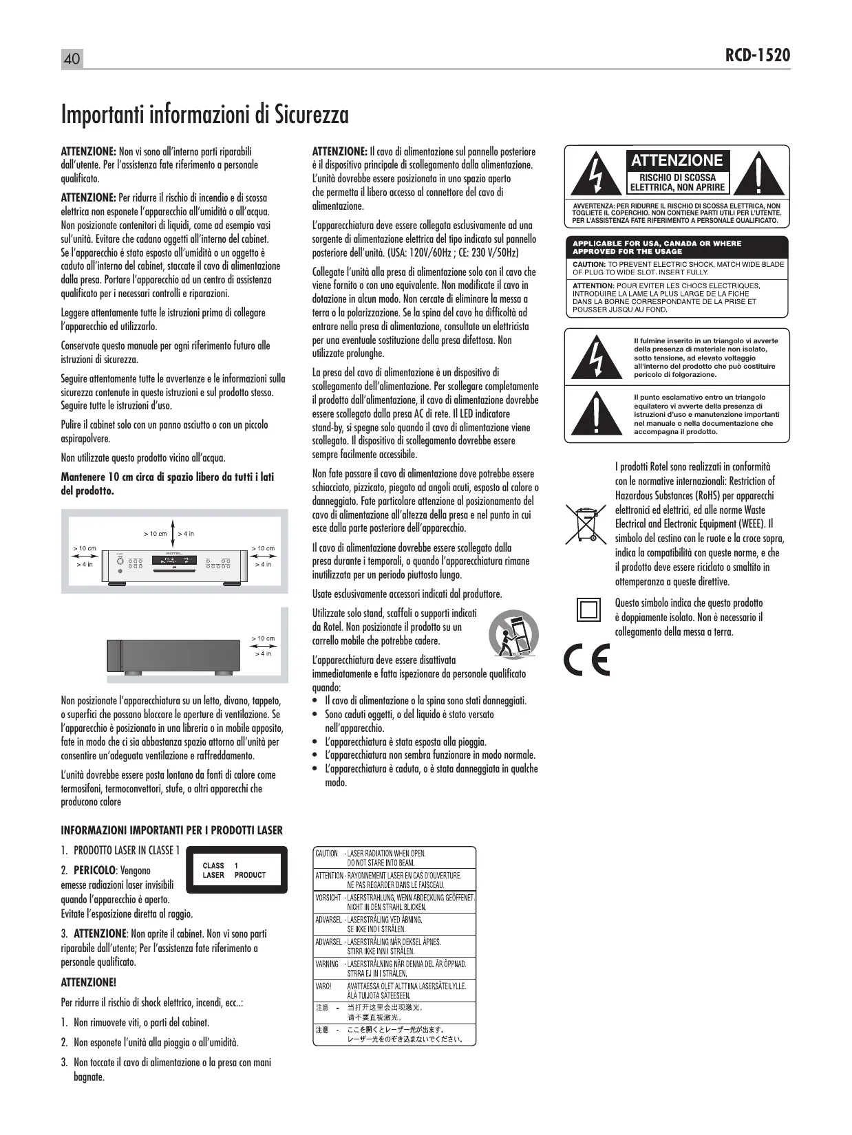 Importanti informazioni di Sicurezza ATTENZIONE: Non vi sono all’interno parti riparabili dall’utente. Per l’assistenza fate riferimento a personale qualificato. ATTENZIONE: Per ridurre il rischio di incendio e di scossa elettrica non esponete l’apparecchio all’umidità o all’acqua. Non posizionate contenitori di liquidi, come ad esempio vasi sul’unità. Evitare che cadano oggetti all’interno del cabinet. Se l’apparecchio è stato esposto all’umidità o un oggetto è caduto all’interno del cabinet, staccate il cavo di alimentazione dalla presa. Portare l’apparecchio ad un centro di assistenza qualificato per i necessari controlli e riparazioni. Leggere attentamente tutte le istruzioni prima di collegare l’apparecchio ed utilizzarlo. Conservate questo manuale per ogni riferimento futuro alle istruzioni di sicurezza. Seguire attentamente tutte le avvertenze e le informazioni sulla sicurezza contenute in queste istruzioni e sul prodotto stesso. Seguire tutte le istruzioni d’uso. Pulire il cabinet solo con un panno asciutto o con un piccolo aspirapolvere. Non utilizzate questo prodotto vicino all’acqua. Mantenere 10 cm circa di spazio libero da tutti i lati del prodotto. ATTENZIONE: Il cavo di alimentazione sul pannello posteriore è il dispositivo principale di scollegamento dalla alimentazione. L’unità dovrebbe essere posizionata in uno spazio aperto che permetta il libero accesso al connettore del cavo di alimentazione. L’apparecchiatura deve essere collegata esclusivamente ad una sorgente di alimentazione elettrica del tipo indicato sul pannello posteriore dell’unità. (USA: 120V/60Hz ; CE: 230 V/50Hz) Collegate l’unità alla presa di alimentazione solo con il cavo che viene fornito o con uno equivalente. Non modificate il cavo in dotazione in alcun modo. Non cercate di eliminare la messa a terra o la polarizzazione. Se la spina del cavo ha difficoltà ad entrare nella presa di alimentazione, consultate un elettricista per una eventuale sostituzione della presa difettosa. Non utilizzate prolunghe. La presa del cavo di alimentazione è un dispositivo di scollegamento dell’alimentazione. Per scollegare completamente il prodotto dall’alimentazione, il cavo di alimentazione dovrebbe essere scollegato dalla presa AC di rete. Il LED indicatore stand-by, si spegne solo quando il cavo di alimentazione viene scollegato. Il dispositivo di scollegamento dovrebbe essere sempre facilmente accessibile. Non fate passare il cavo di alimentazione dove potrebbe essere schiacciato, pizzicato, piegato ad angoli acuti, esposto al calore o danneggiato. Fate particolare attenzione al posizionamento del cavo di alimentazione all’altezza della presa e nel punto in cui esce dalla parte posteriore dell’apparecchio. Il cavo di alimentazione dovrebbe essere scollegato dalla presa durante i temporali, o quando l’apparecchiatura rimane inutilizzata per un periodo piuttosto lungo. Usate esclusivamente accessori indicati dal produttore. Utilizzate solo stand, scaffali o supporti indicati da Rotel. Non posizionate il prodotto su un carrello mobile che potrebbe cadere. Non posizionate l’apparecchiatura su un letto, divano, tappeto, o superfici che possano bloccare le aperture di ventilazione. Se l’apparecchio è posizionato in una libreria o in mobile apposito, fate in modo che ci sia abbastanza spazio attorno all’unità per consentire un’adeguata ventilazione e raffreddamento. L’unità dovrebbe essere posta lontano da fonti di calore come termosifoni, termoconvettori, stufe, o altri apparecchi che producono calore