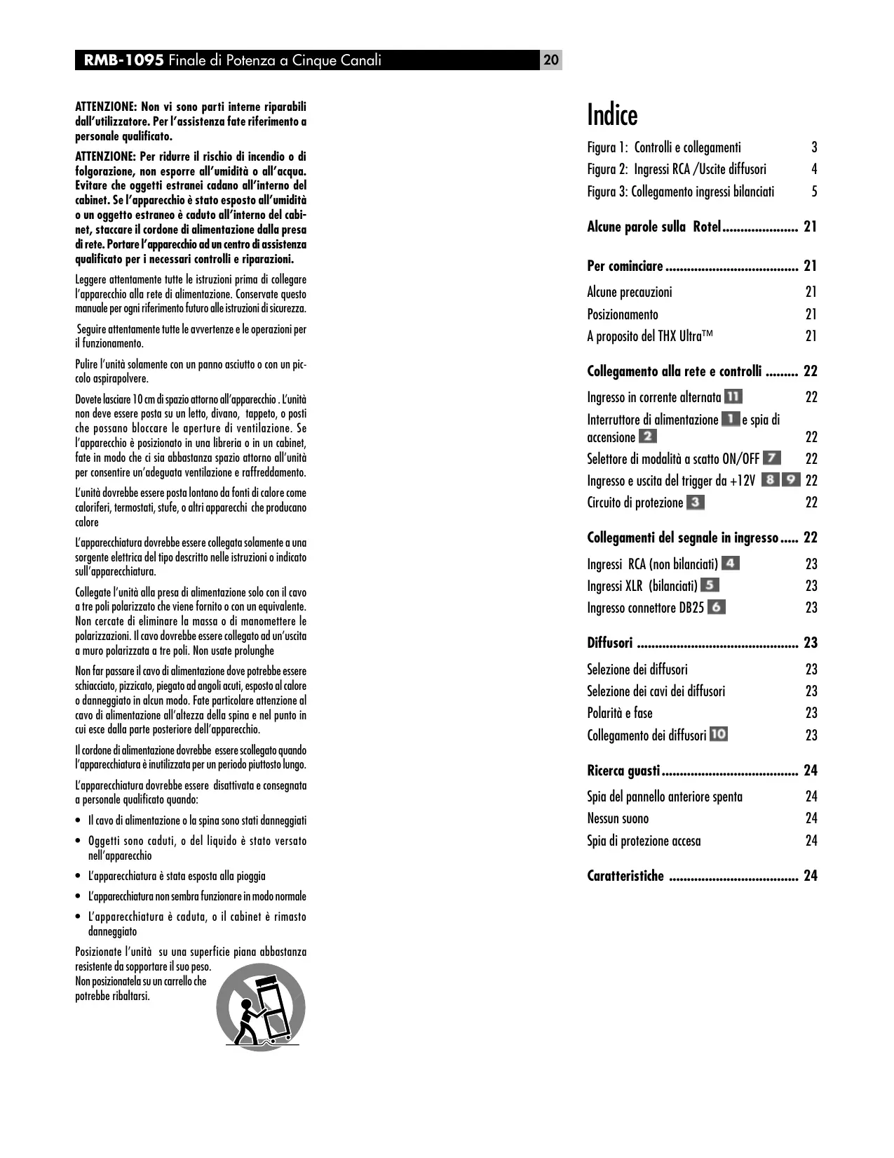 Alcune Parole Sulla Rotel Una famiglia, la cui passione per la musica ha spinto a realizzare componenti hi-fi di elevata qualità, fondò la Rotel più di 30 anni fa. Attraverso gli anni la passione è rimasta intatta e l’obbiettivo di offrire prodotti eccezionali agli audiofili e amanti della musica ad un costo non elevato è condiviso da tutti alla Rotel. Gli ingegneri lavorano come una squadra affiatata, ascoltando e mettendo a punto ogni nuovo prodotto finché non raggiunge perfettamente i loro standard musicali. Sono liberi di scegliere i componenti in qualsiasi parte del mondo al fine di realizzare il prodotto nel miglior modo possibile. Così potrete trovare condensatori provenienti dall’Inghilterra e dalla Germania, semiconduttori dal Giappone o dagli Stati Uniti, mentre i trasformatori toroidali sono prodotti proprio dalla Rotel. La fama di eccellenza della Rotel è stata guadagnata grazie a centinaia di ottime recensioni e riconoscimenti conferiti dai più autorevoli esperti del settore, che ascoltano la musica ogni giorno. I loro commenti confermano l’ obbiettivo della società - La ricerca di un apparecchio che sia musicale, affidabile e conveniente. Vi ringraziamo per aver scelto questo prodotto augurandovi molte ore di piacevole intrattenimento musicale. Per Cominciare Grazie per aver acquistato il finale di potenza stereo RMB-1095. Utilizzato in un impianto hi-fi di alta qualità o home theater, il vostro amplificatore Rotel vi assicurerà anni di intrattenimento musicale. Nell’RMB-1095 nulla è solo accennato. E’ un poderoso finale a cinque canali, in grado di erogare una potenza estremamente elevata nelle applicazioni più impegnative. Infatti, quello che potrà limitare i livelli di uscita dell’RMB-1095 sarà spesso la capacità di alimentazione del vostro impianto elettrico. Transistor di potenza discreti, un poderoso stadio di alimentazione con trasformatori toroidali, componenti di qualità superiore e il Balanced Design della Rotel assicurano una qualità sonora superba. La elevata capacità di corrente consente all’RMB-1095 di pilotare senza difficoltà i carichi più impegnativi. Italiano Sappiate che l’RMB-1095 è in grado di produrre elevati livelli di potenza, oltre 200 watt per canale su 8 ohm e 330 watt su 4 ohm. Assicuratevi che i vostri diffusori possano sostenere la potenza dell’RMB-1095. Se avete dei dubbi sui vostri diffusori, chiedete al vostro rivenditore autorizzato per avere dei consigli. Allo stesso modo, ricordate il peso dell’amplificatore quando scegliete un luogo per l’installazione.Assicuratevi che lo scaffale o il cabinet possano sostenere il notevole volume. Considerate anche il notevole peso dell’amplificatore quando dovete sollevarlo. Ancora una volta usate il buon senso. L’RMB-1095 è facile da attivare e da installare. Se avete qualche esperienza con altri finali di potenza stereo, non dovreste trovare nulla di strano. Inserite una coppia di cavi RCA di alta qualità dal vostro preamplificatore negli ingressi dell’amplificatore , collegate i vostri diffusori e divertitevi. NOTA: L’RMB-1095 è provvisto di rotelle sul retro per aiutarvi a posizionarlo. In alternativa, l’RMB-1095 fornisce una coppia di ingressi bilanciati per un utilizzo con preamplificatori o processori che offrono questi collegamenti XLR a basso disturbo. Alcune Precauzioni Leggete attentamente questo manuale. Oltre alle istruzioni relative alle istruzioni di base a al funzionamento fornisce interessanti informazioni su diverse configurazioni di sistema RMB-1095 così come indicazioni generali che vi aiuteranno a ottenere prestazioni ottimali dal vostro impianto. Vi preghiamo di contattare il vostro rivenditore autorizzato Rotel per consigli o domande. Inoltre tutti noi alla Rotel saremo ben lieti di rispondere alle vostre domande e commenti. Conservate l’imballaggio dell’RMB-1095 e tutto il materiale interno per un uso futuro. Trasportare l’RMB-1095 in un imballo non originale potrebbe danneggiare il vostro amplificatore. Assicuratevi anche di conservare la ricevuta della vendita originale. E’ il vostro migliore documento per la data di acquisto di cui avrete bisogno ogni volta sia necessario il servizio di garanzia. Posizionamento L’RMB-1095 genera calore durante il suo normale funzionamento. Le alette di raffreddamento e le aperture di ventilazione poste sull’amplificatore sono progettate per dissipare questo calore. Le fessure di ventilazione sulla parte superiore devono essere libere. Vi dovrebbero essere 10 cm di spazio libero attorno allo chassis e un flusso d’aria adeguato per evitare il surriscaldamento dell’amplificatore. A proposito del sistema THX Ultra™ THX rappresenta un insieme esclusivo di standard e di tecnologie stabiliti dalla famosa casa cinematografica Lucasfilms Ltd. Il THX è nato dal personale desiderio di George Lucas di rendere l’esperienza della colonna sonora di un film - tanto nei teatri che nel vostro home cinema - il più possibile fedele a come il regista la intendeva. Le colonne sonore dei film vengono miscelate in speciali sale cinematografiche chiamate sale di doppiaggio e sono progettate per essere riprodotte in teatri provvisti di apparecchi e condizioni similari. La traccia musicale creata per i cinema è poi trasferita direttamente su Laserdisc, nastro VHS, DVD, ecc. e non viene modificata per la riproduzione in un piccolo ambiente . I tecnici del THX hanno sviluppato tecnologie brevettate per tradurre accuratamente il suono dall’ambiente della sala cinematografica a quello domestico, correggendo i possibili errori tonali e di spazialità. Prima che qualsiasi componente home theater possa essere certificato THX Ultra, deve essere dotato delle tecnologie THX e superare anche una serie di rigorosi controlli di qualità e di resa. Solo allora un prodotto può esporre il logo THX Ultra che rappresenta la vostra garanzia che i prodotti Home Theater che voi avete acquistato vi daranno u