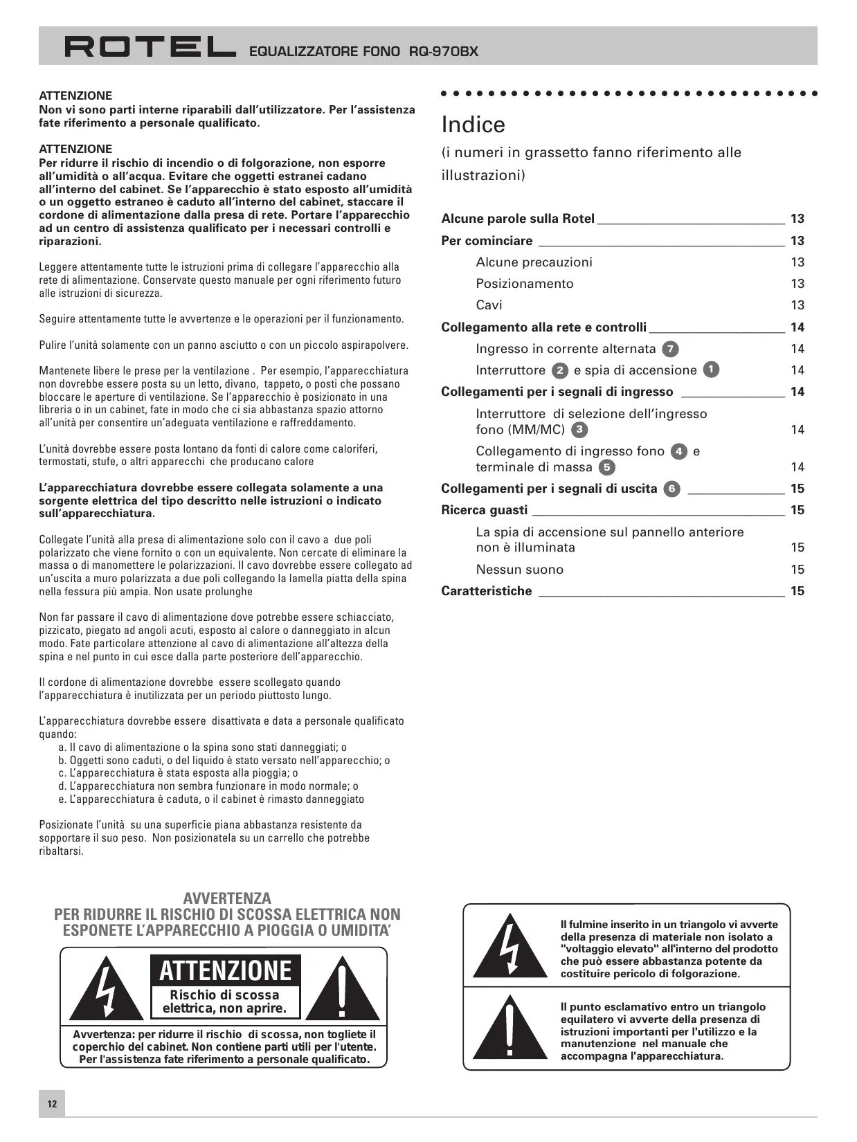 Leggete attendamente quello manuale. Oltre alle istruzioni generali che vi aiuteranno ad otteneri migliorari risultati sonori fornisce complete informazioni su come inseire il vosto RQ-970BX nel vosto impianto. Vi preghiamo di contattare il vosto rivenditore autorizzato Rotel per consiglio o domande. Inoltre tutti nei alla Rotel saremo ben lieti di rispondere alle vostre domande e commenti.
