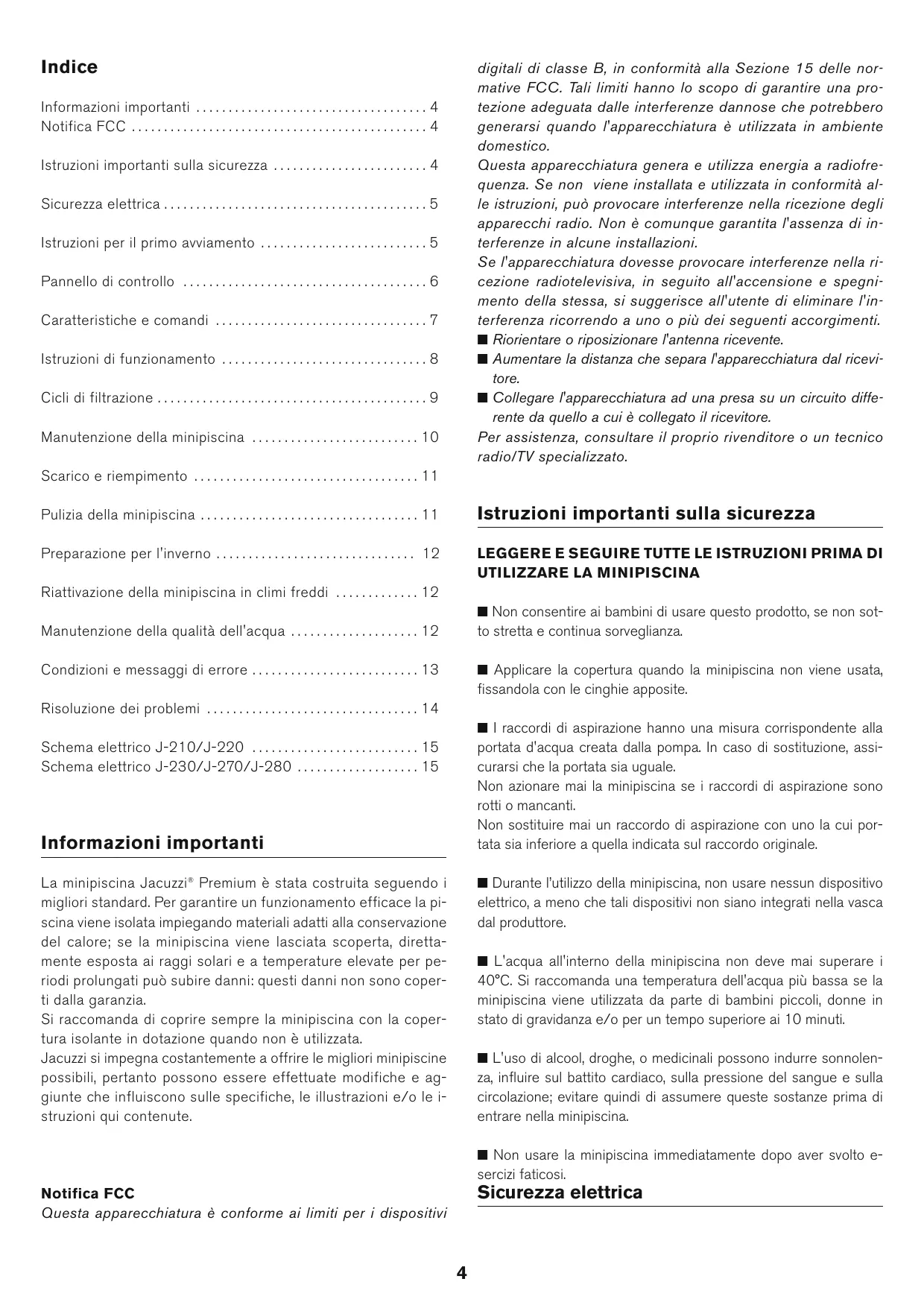- Schema elettrico J-230/J-270/J-280 Informazioni importanti Durante l’utilizzo della minipiscina, non usare nessun dispositivo La minipiscina Jacuzzi® Premium è stata costruita seguendo i migliori standard. Per garantire un funzionamento efficace la piscina viene isolata impiegando materiali adatti alla conservazione del calore; se la minipiscina viene lasciata scoperta, direttamente esposta ai raggi solari e a temperature elevate per periodi prolungati può subire danni: questi danni non sono coperti dalla garanzia. Si raccomanda di coprire sempre la minipiscina con la copertura isolante in dotazione quando non è utilizzata. Jacuzzi si impegna costantemente a offrire le migliori minipiscine possibili, pertanto possono essere effettuate modifiche e aggiunte che influiscono sulle specifiche, le illustrazioni e/o le istruzioni qui contenute. elettrico, a meno che tali dispositivi non siano integrati nella vasca dal produttore. L'acqua all'interno della minipiscina non deve mai superare i 40°C. Si raccomanda una temperatura dell'acqua più bassa se la minipiscina viene utilizzata da parte di bambini piccoli, donne in stato di gravidanza e/o per un tempo superiore ai 10 minuti. L'uso di alcool, droghe, o medicinali possono indurre sonnolen- za, influire sul battito cardiaco, sulla pressione del sangue e sulla circolazione; evitare quindi di assumere queste sostanze prima di entrare nella minipiscina. Non usare la minipiscina immediatamente dopo aver svolto e- sercizi faticosi. Sicurezza elettrica Notifica FCC Questa apparecchiatura è conforme ai limiti per i dispositivi p. 15
