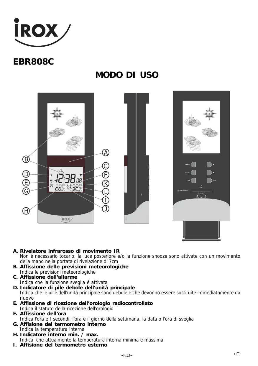 A. Rivelatore infrarosso di movimento IR Non è necessario tocarlo: la luce posteriore e/o la funzione snooze sono attivate con un movimento della mano nella portata di rivelazione di 7cm B. Affissione delle previsioni meteorologiche Indica le previsioni meteorologiche C. Affissione dell’allarme Indica che la funzione sveglia é attivata D. Indicatore di pile debole dell’unità principale Indica che le pille dell’unità principale sono debole e che devonno essere sostituite immediatamente da nuovo E. Affissione di ricezione dell’orologio radiocontrollato Indica il statuto della ricezione dell’orologio F. Affissione dell’ora Indica l’ora e I secondi, l’ora e il giorno della settimana, la data o l’ora di sveglia G. Affisione del termometro interno Indica la temperatura interna H. Indicatore interno min. / max. Indica che attualmente la temperatura interna minima e massima